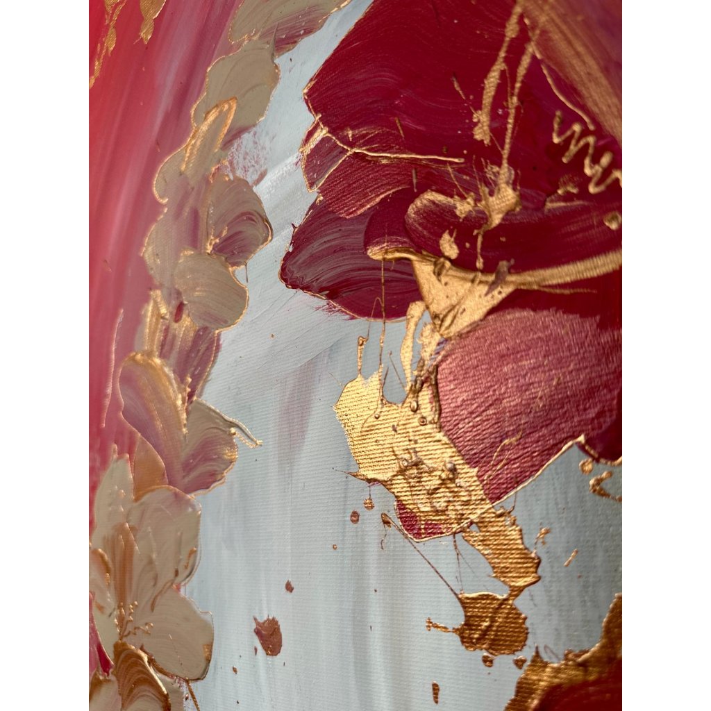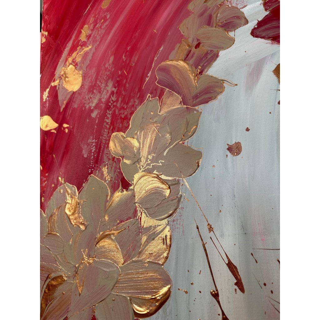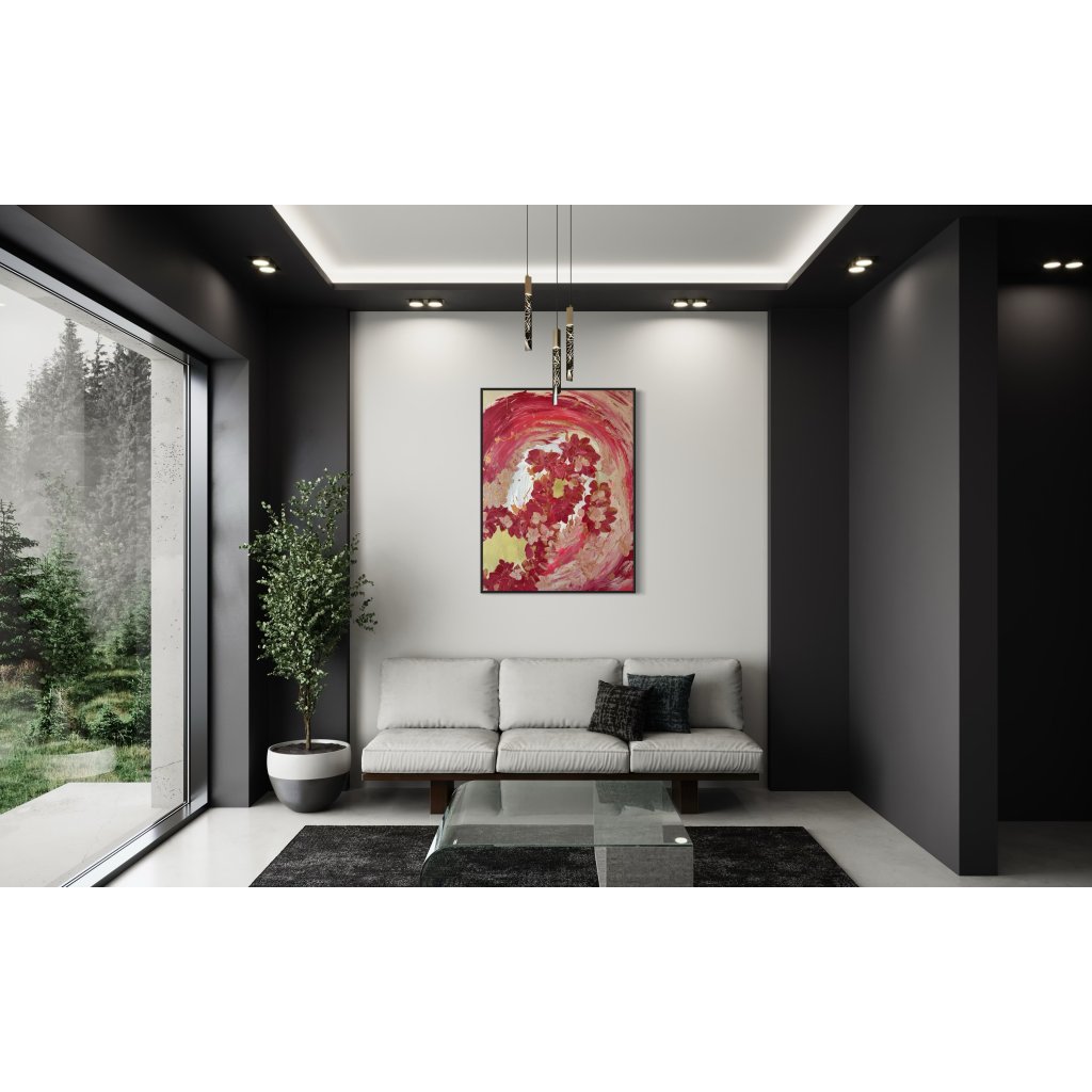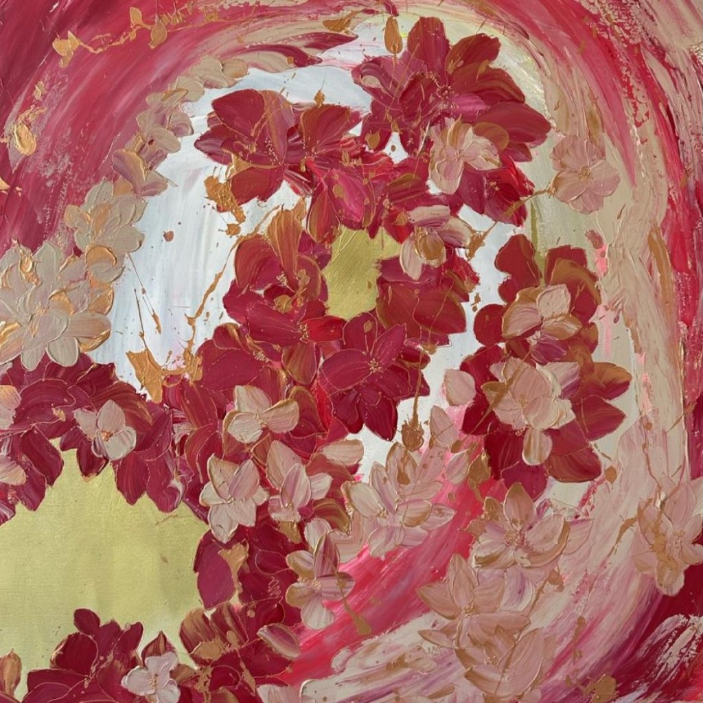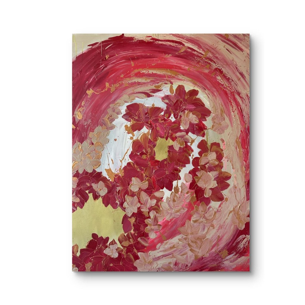 Obraz Asijská jemnost oslavuje křehkou krásu přírody a jemnost ženské energie, jak je známe z tradičního asijského umění. V centru kompozice se rozehrává vír květů, jejichž zlaté a růžové tóny vytvářejí harmonický tanec na pozadí teplé škály červené.