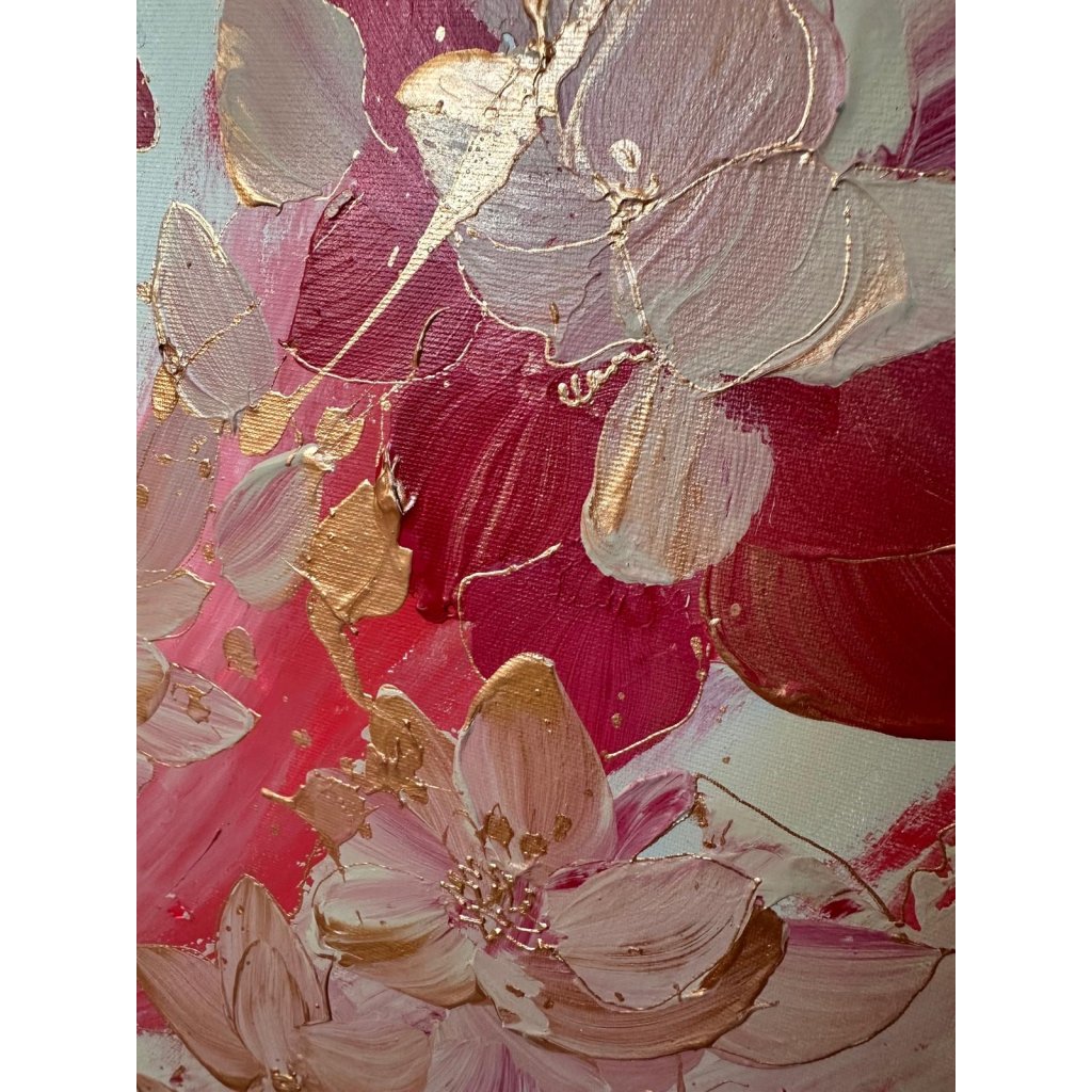 Květy připomínají sakury či pivoňky – symboly jara, znovuzrození a čistoty. Zlaté akcenty dodávají malbě luxusní nádech a podtrhují slavnostní atmosféru klidu a elegance.
