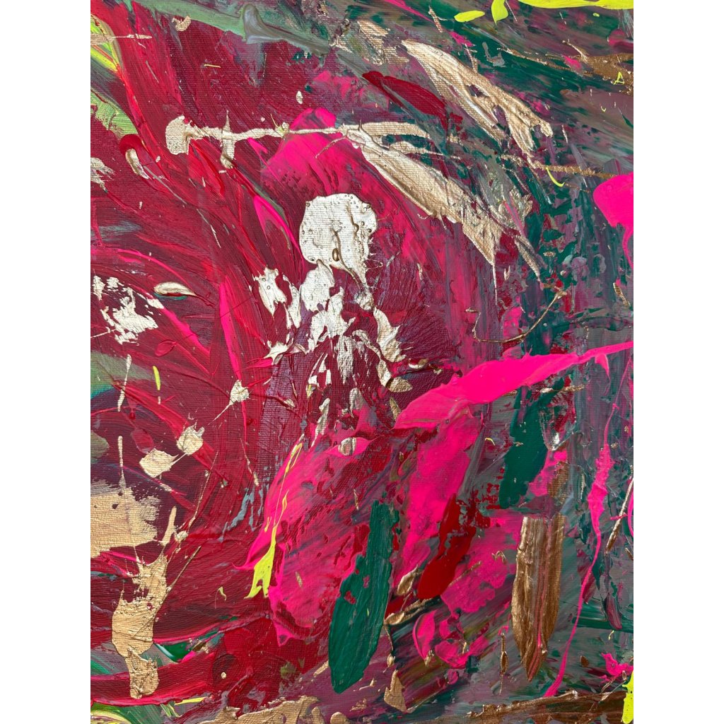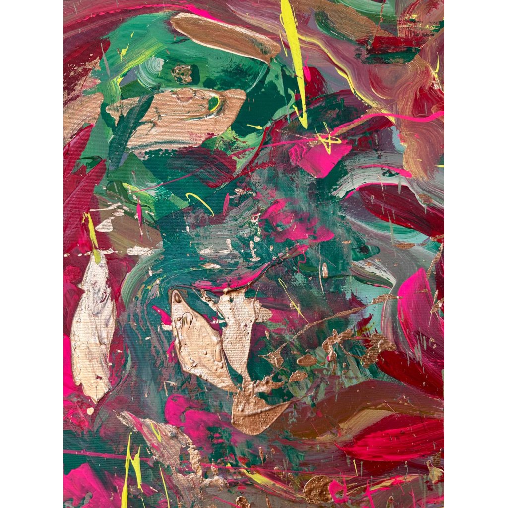 Tah štětcem je expresivní, vrstvy barvy se prolínají, jako by tančily ve víru přírody. Žluté a hnědé akcenty vnášejí do kompozice další dynamiku a hloubku, zatímco celková energie malby působí spontánně, svobodně a živelně.