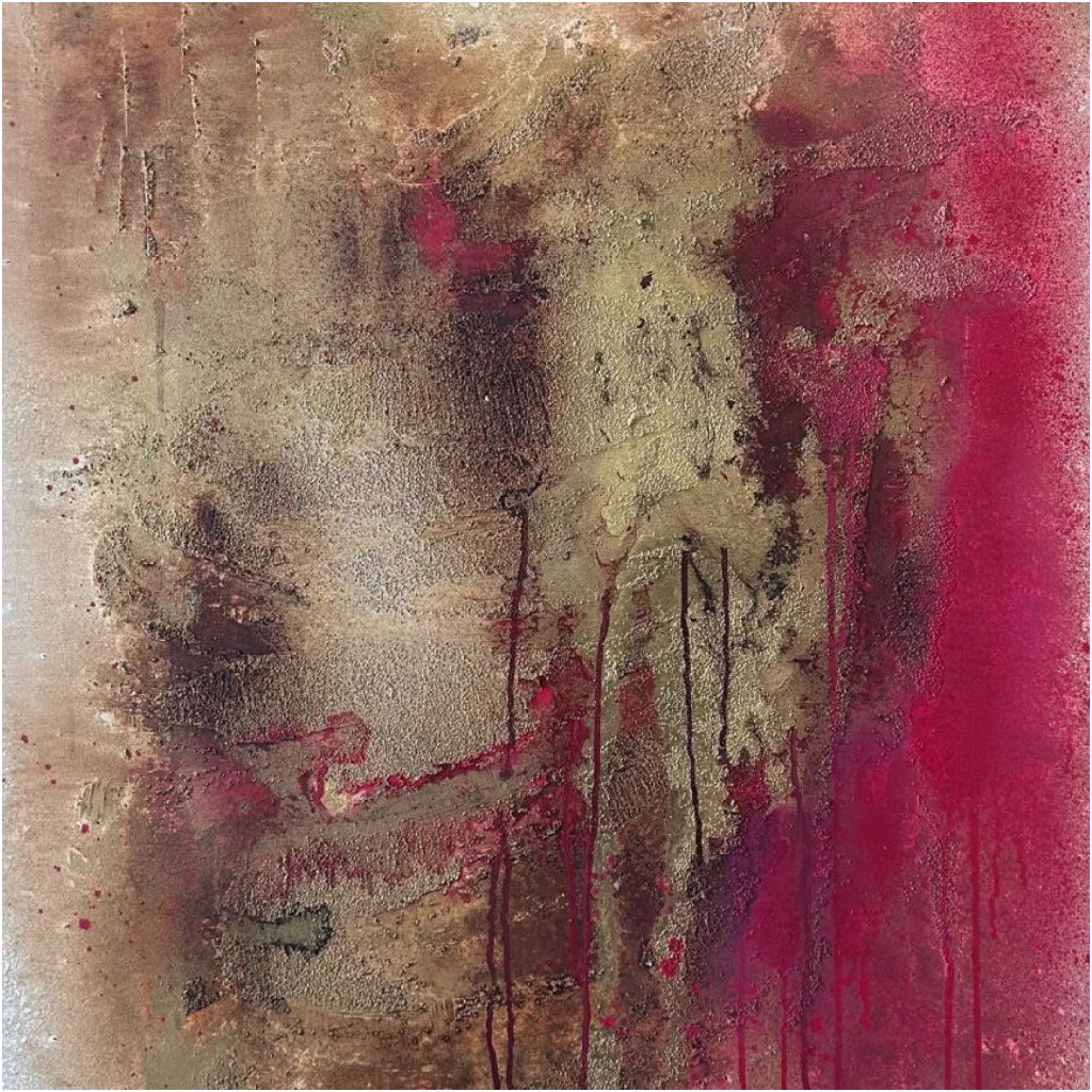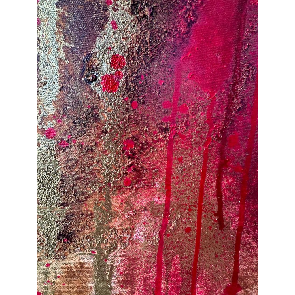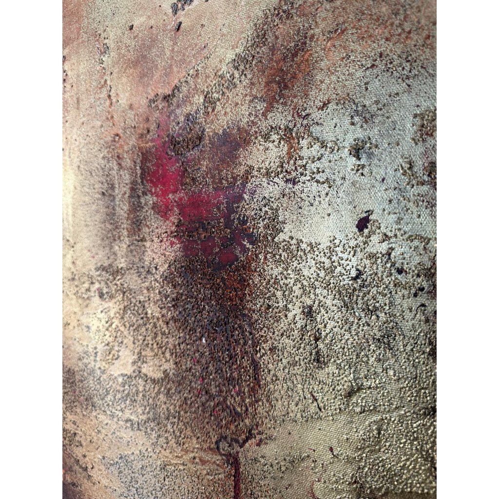 Strukturovaný povrch přináší pocit nehostinnosti, zároveň však i síly a odolnosti. Stékající barvy odkazují na stopy, které zanechává čas, příroda i člověk – bolest i hrdost. Každý tah štětce i kapka barvy nese v sobě příběh, který nelze přehlédnout.