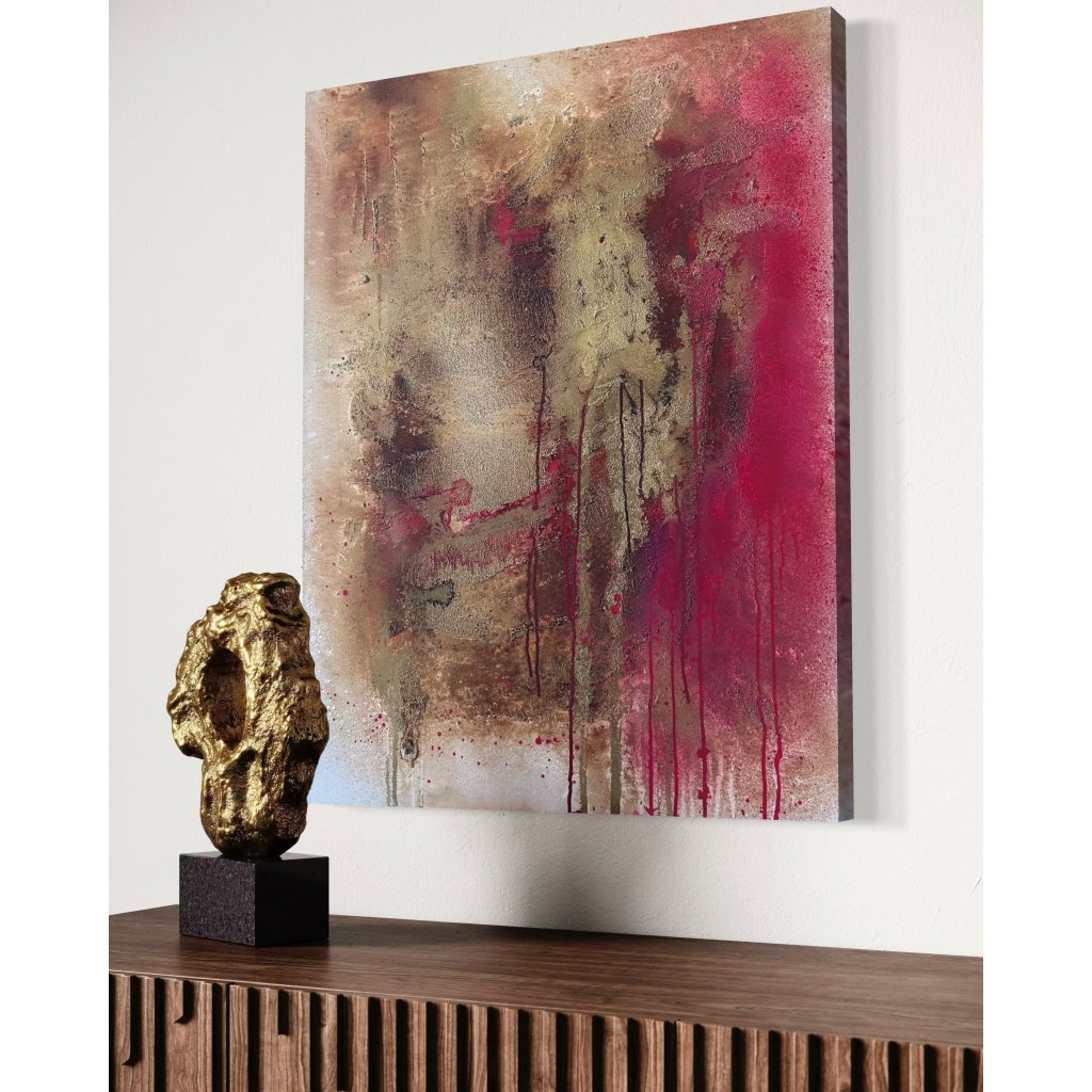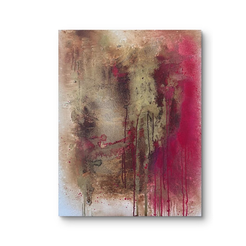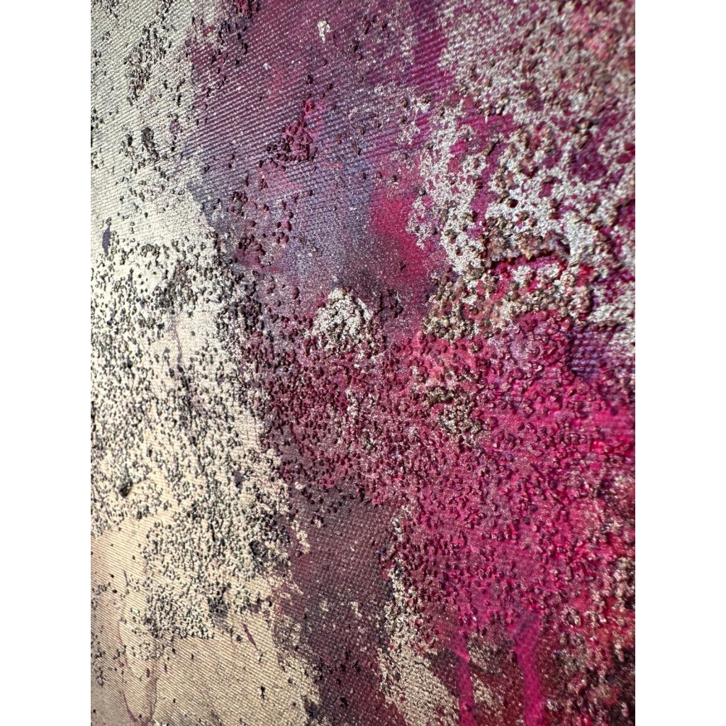 Strukturovaný povrch přináší pocit nehostinnosti, zároveň však i síly a odolnosti. Stékající barvy odkazují na stopy, které zanechává čas, příroda i člověk – bolest i hrdost. Každý tah štětce i kapka barvy nese v sobě příběh, který nelze přehlédnout.