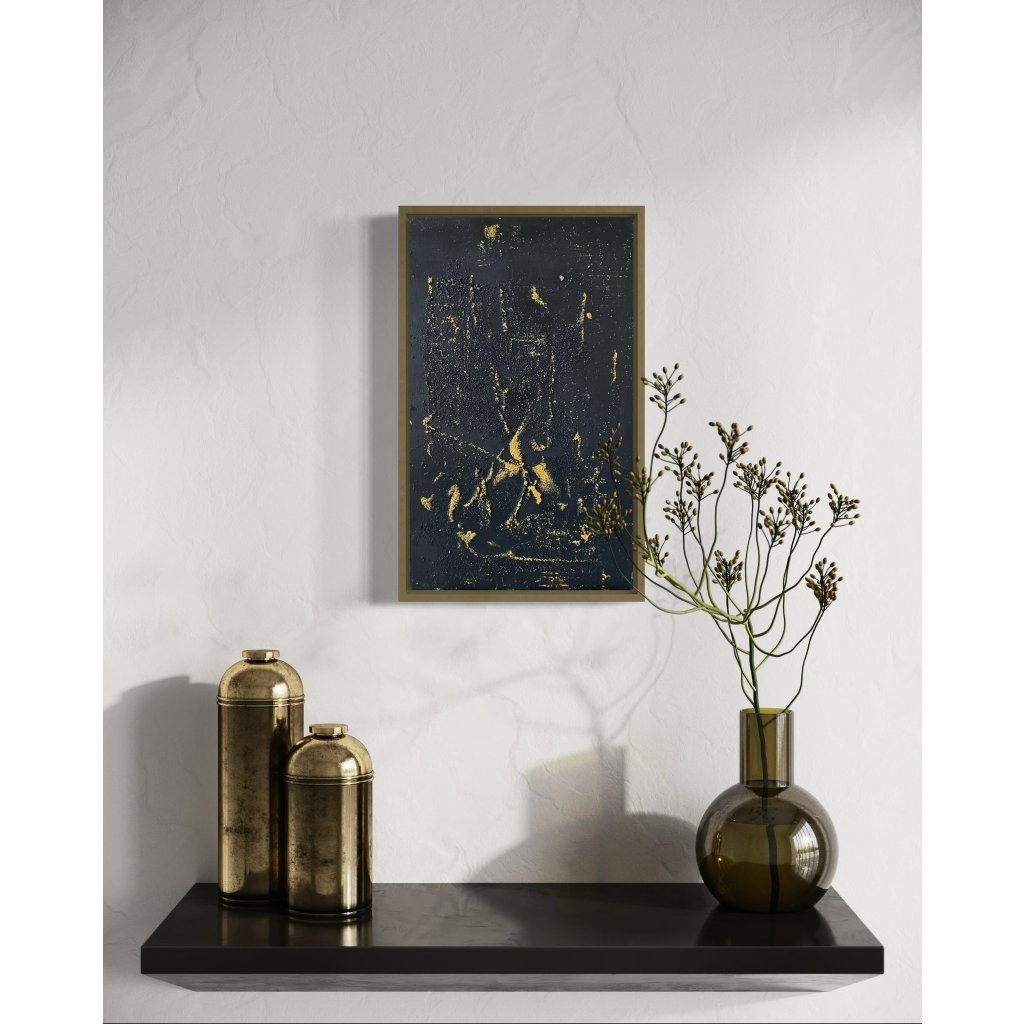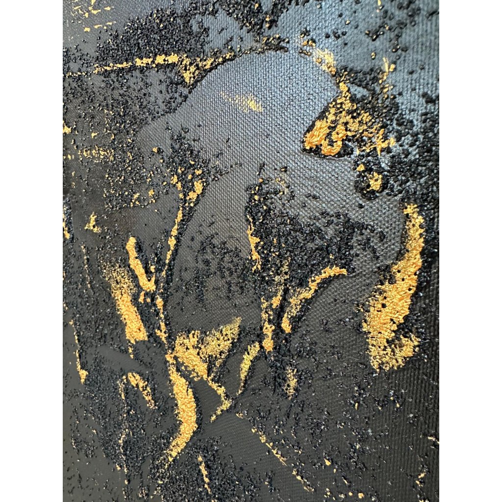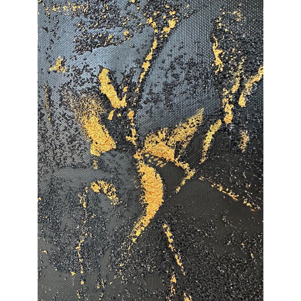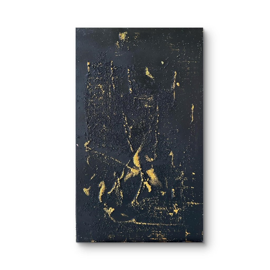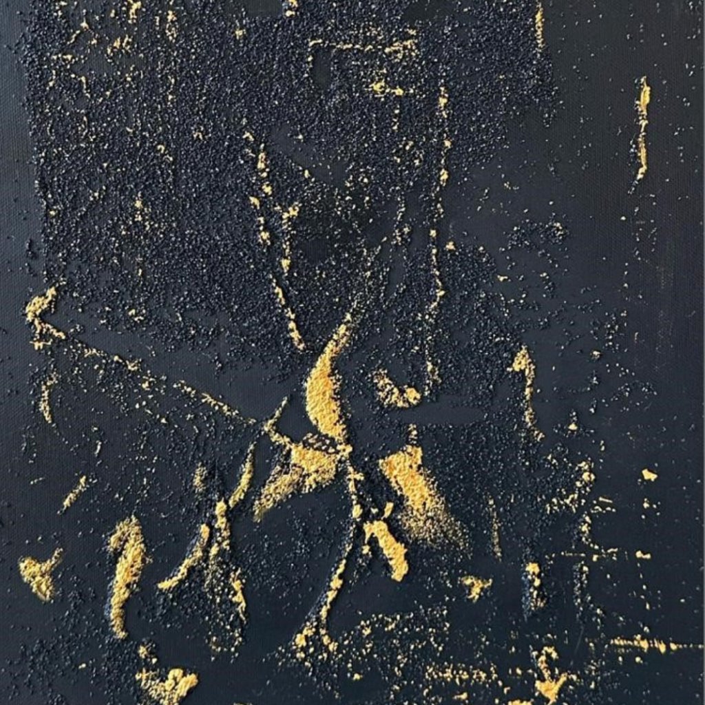 Obraz Hvězdná obloha zachycuje majestátní ticho noci, kdy se nad hlavou rozprostírá hluboká temnota vesmíru, posetá záblesky zlatých hvězd. Temný podklad s plastickým povrchem dodává dílu hmotnost a hloubku, zatímco zlaté akcenty působí jako mihotající se světla vzdálených galaxií.