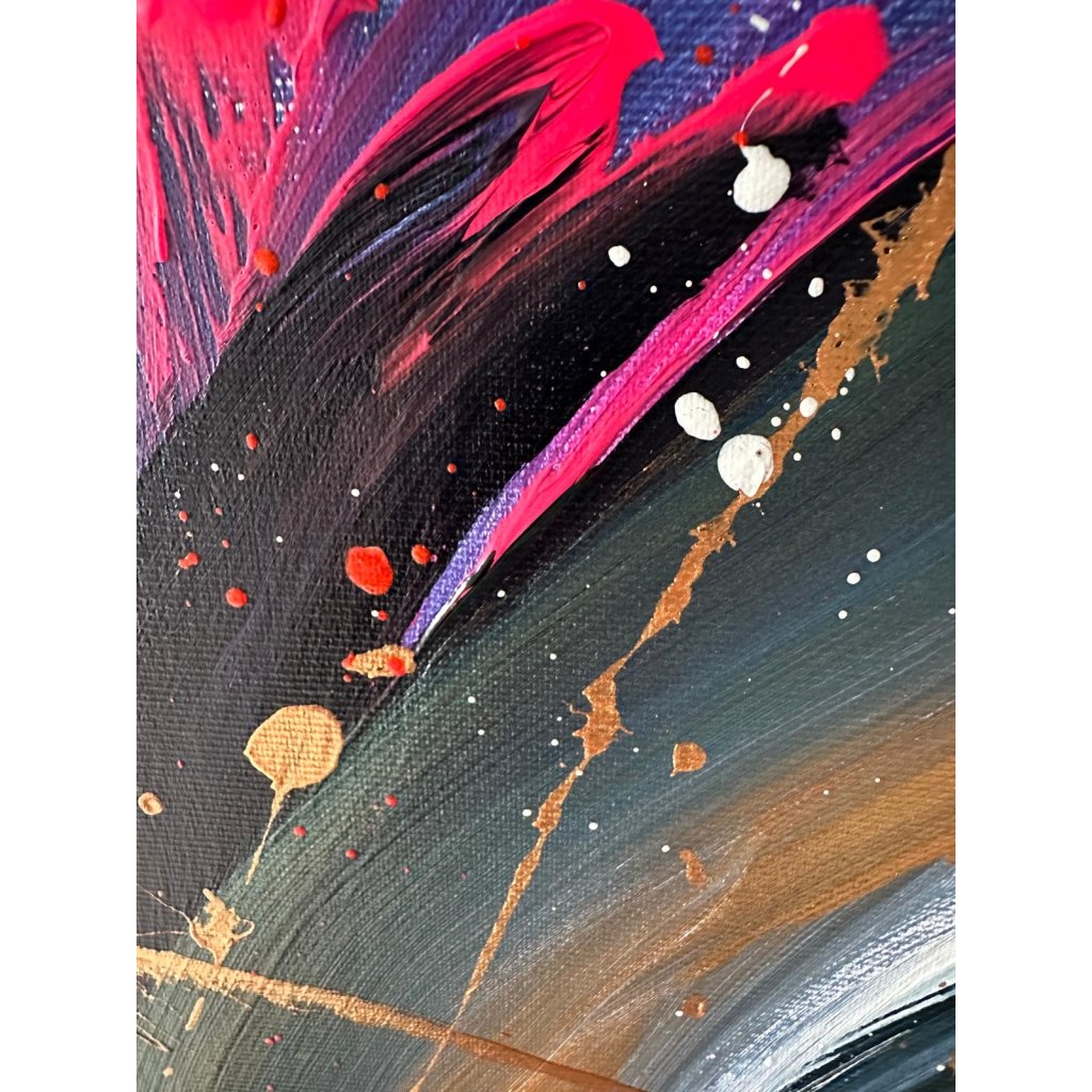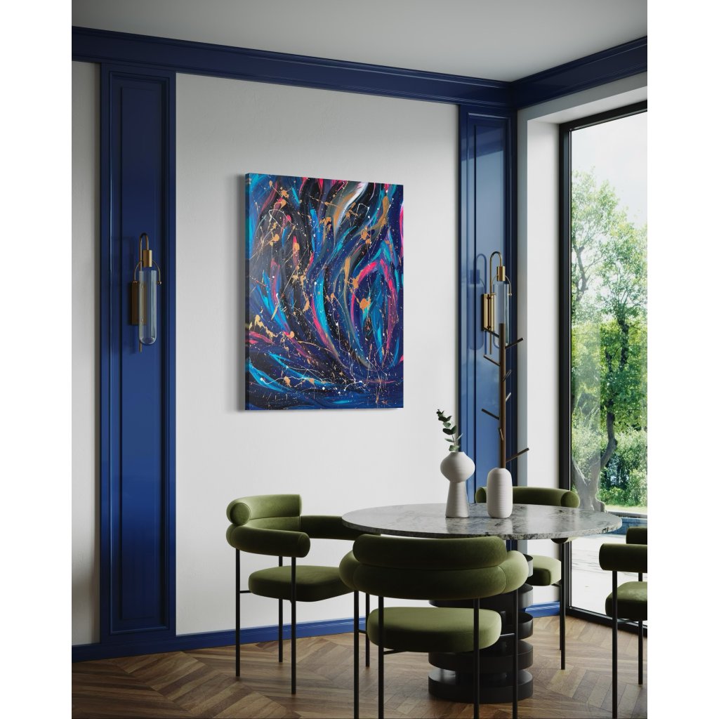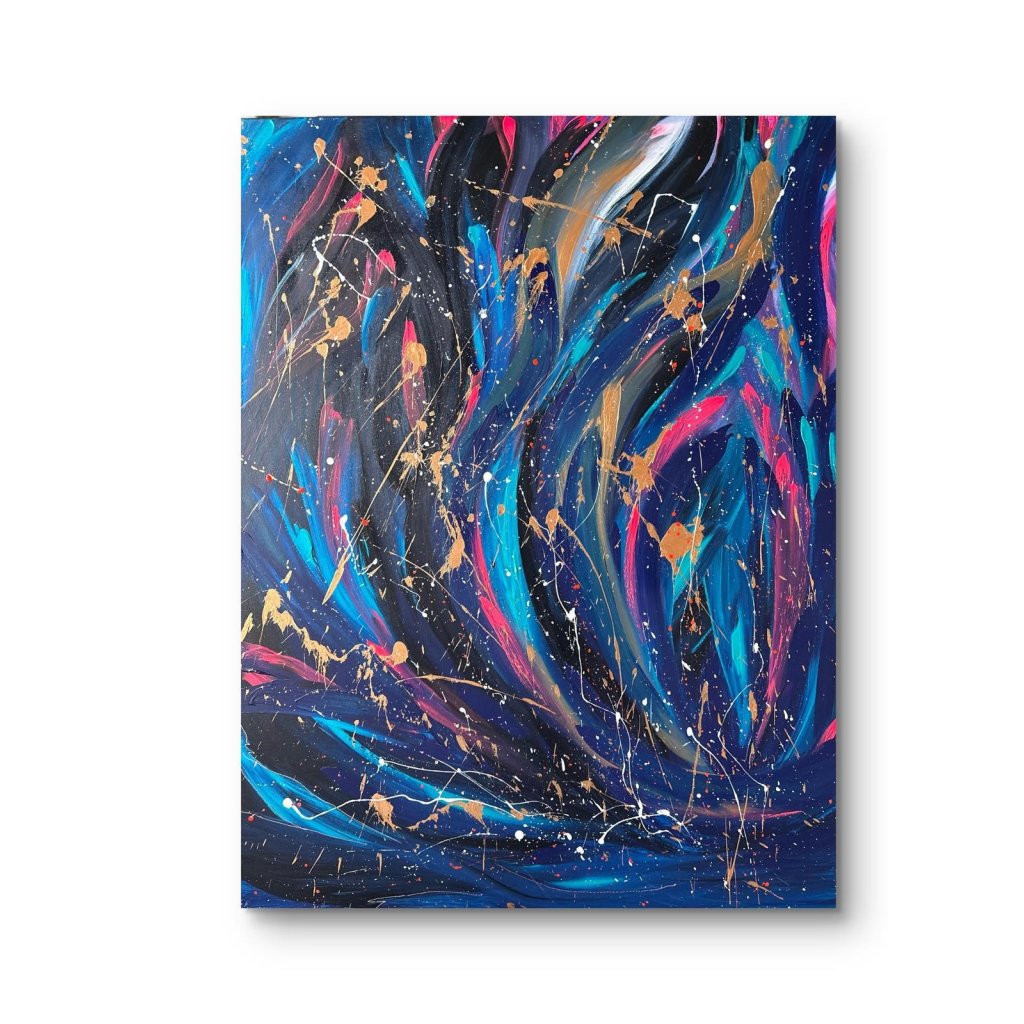 Tento abstraktní obraz působí jako vizuální báseň o zrození a pohybu, o tichém třpytu v temnotě. Hvězdný prach je připomínkou krásy, která existuje mimo naše chápání – krásy, kterou si ale můžeme přenést do svého prostoru.