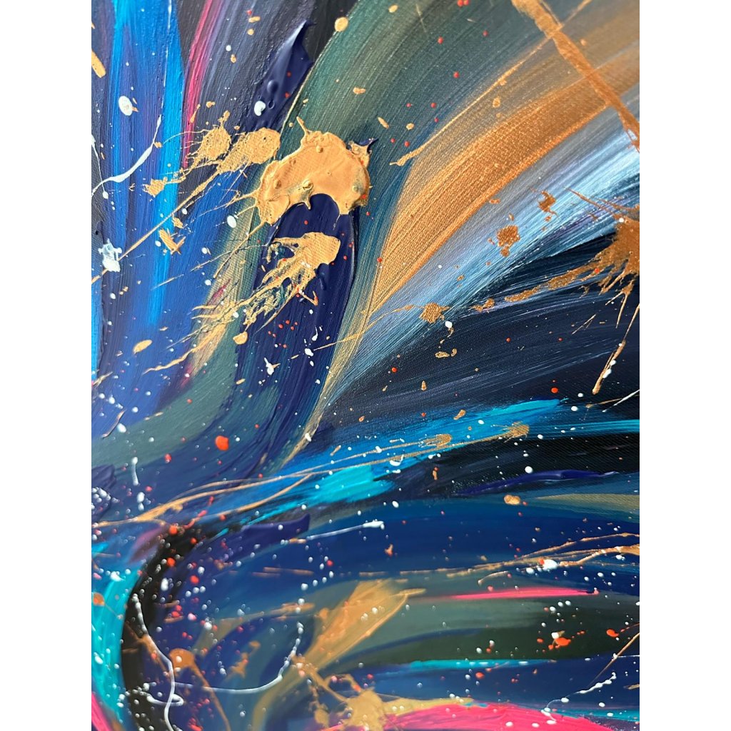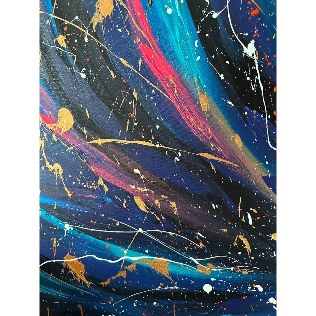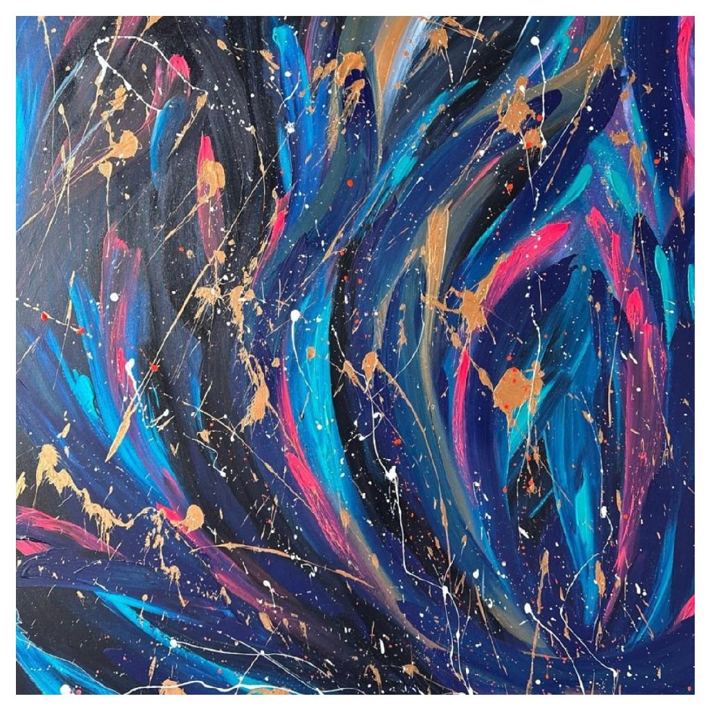 Hvězdný prach zachycuje magický okamžik, kdy se nekonečný vesmír dotýká našeho světa v podobě zářivých částeček, jež křižují noční oblohu. Tahy štětcem v odstínech temně modré, tyrkysové, růžové a fialové vytvářejí dojem víru energie, zatímco zlaté a bílé stříkance evokují světélkující prach z hvězdných výbuchů.