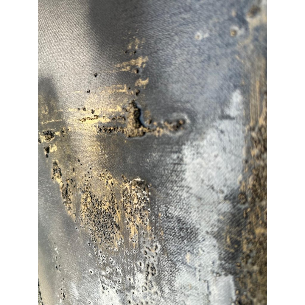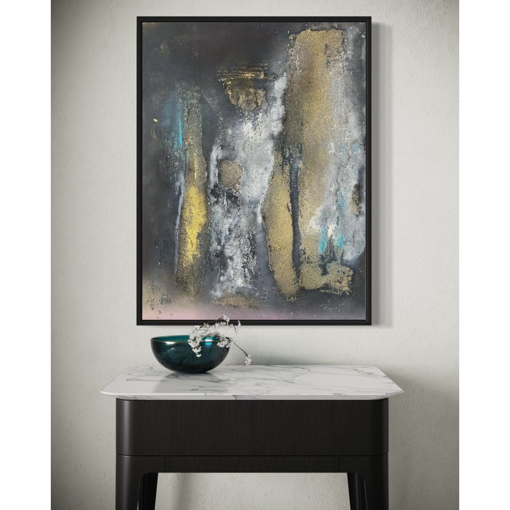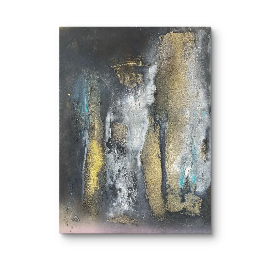 Tajemná silueta popové ikony vystupuje z temného pozadí jako duchovní přítomnost v mlze vzpomínek. Obraz Jackson zachycuje Michaela Jacksona neotřelým, abstraktním způsobem – postava je jen naznačena pomocí vrstev akrylu, pískové textury a zlatých tónů, které evokují jeho hvězdný lesk a neopakovatelný styl.