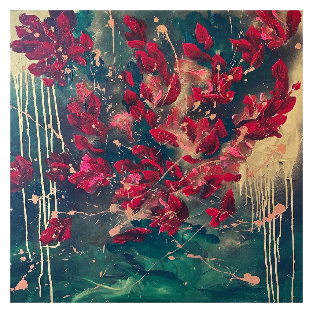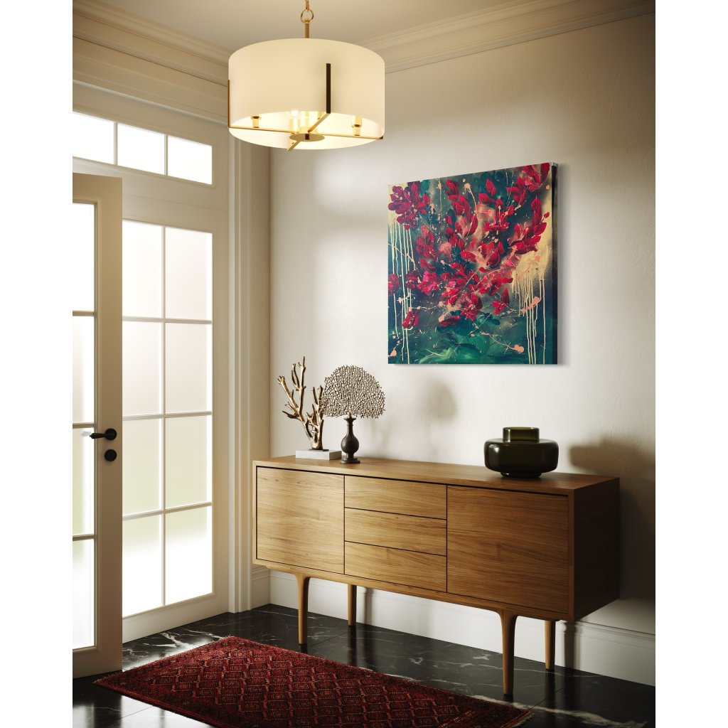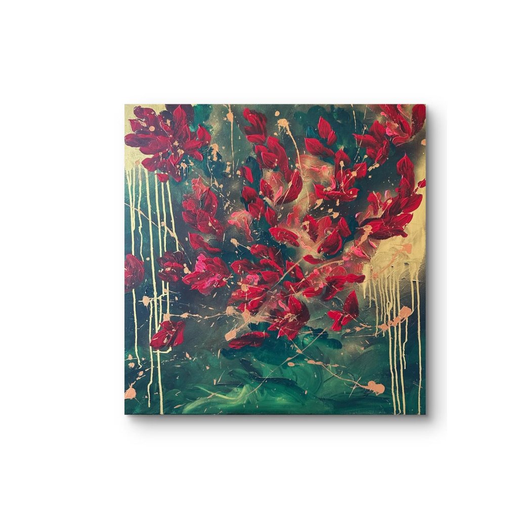 Obraz Kouzlo v sobě nese sílu přírody a magickou energii barev. Výrazné rudé květy jako by tančily na smaragdovém pozadí, které přechází do tajemných tmavých odstínů s doteky zlaté a měděné barvy. Tato barevná harmonie vyvolává pocit vzrušení, elegance a zároveň hlubokého klidu.