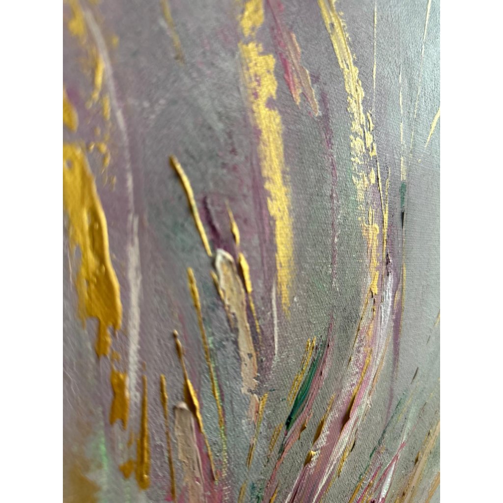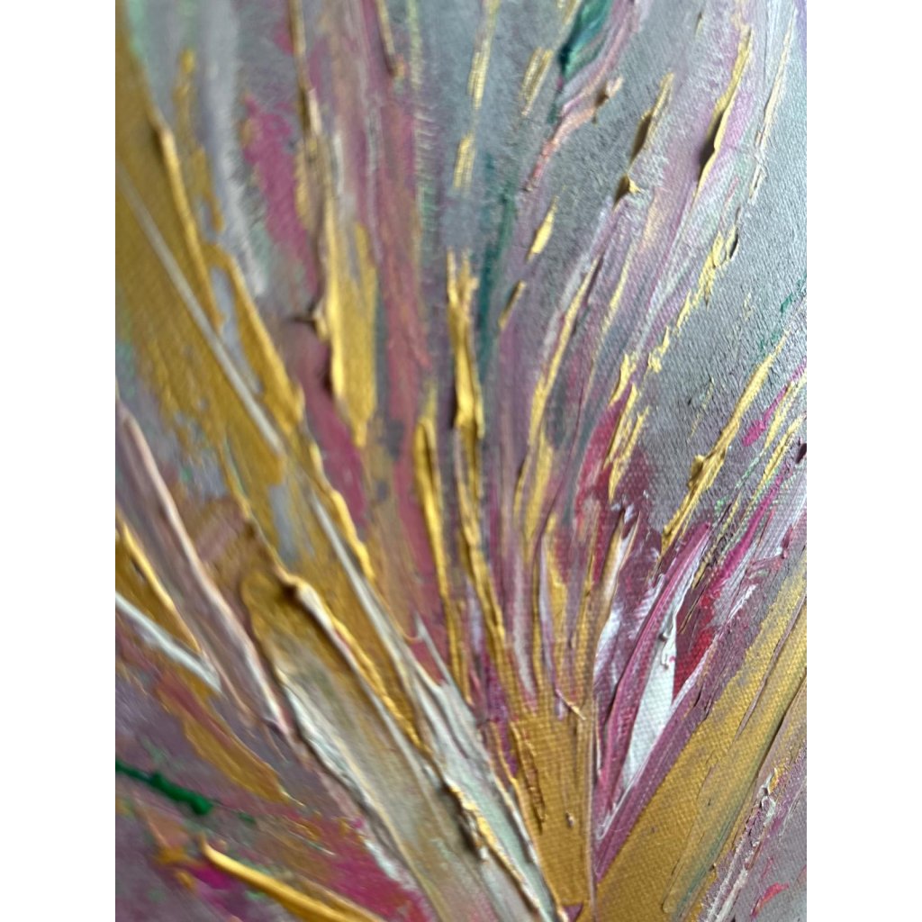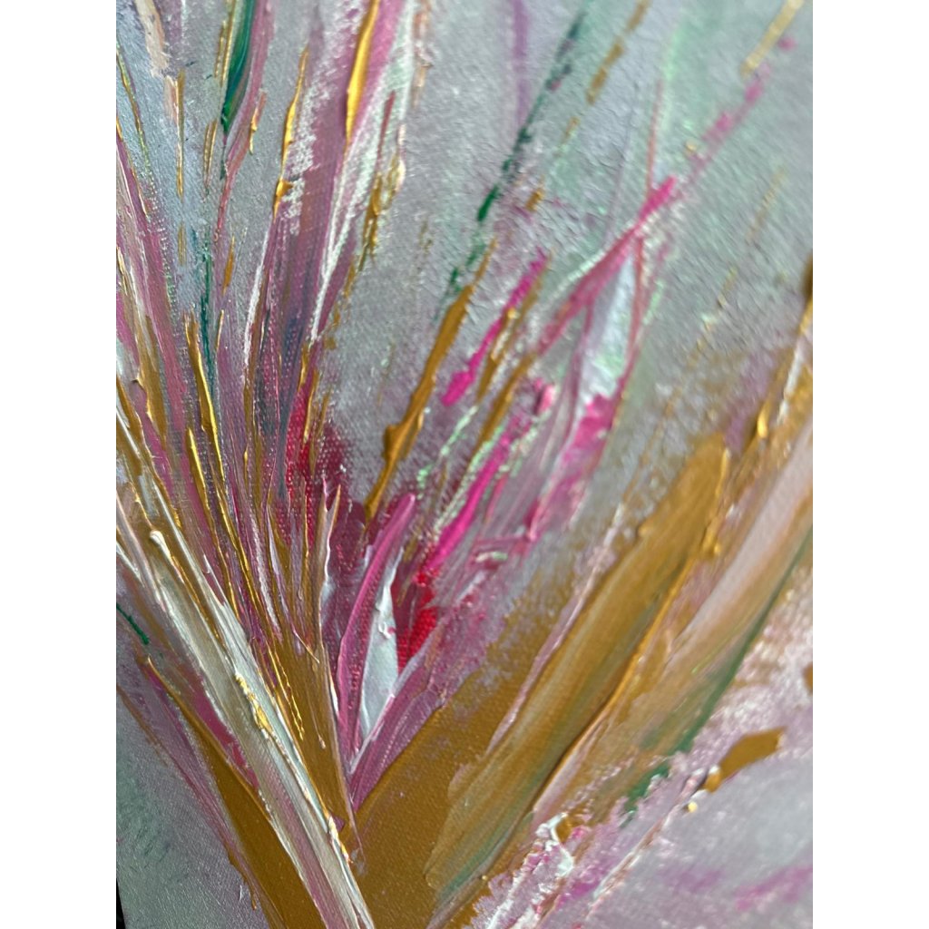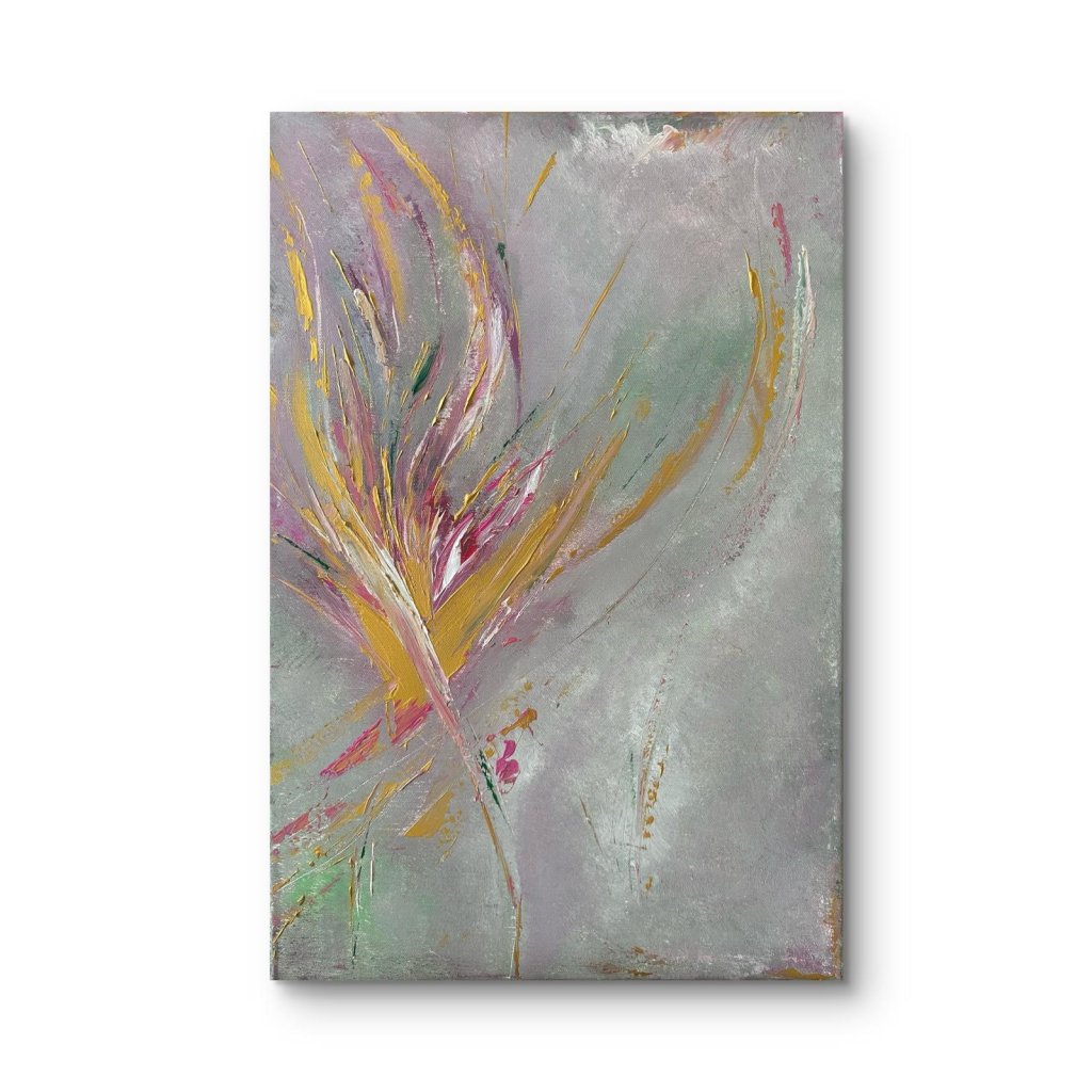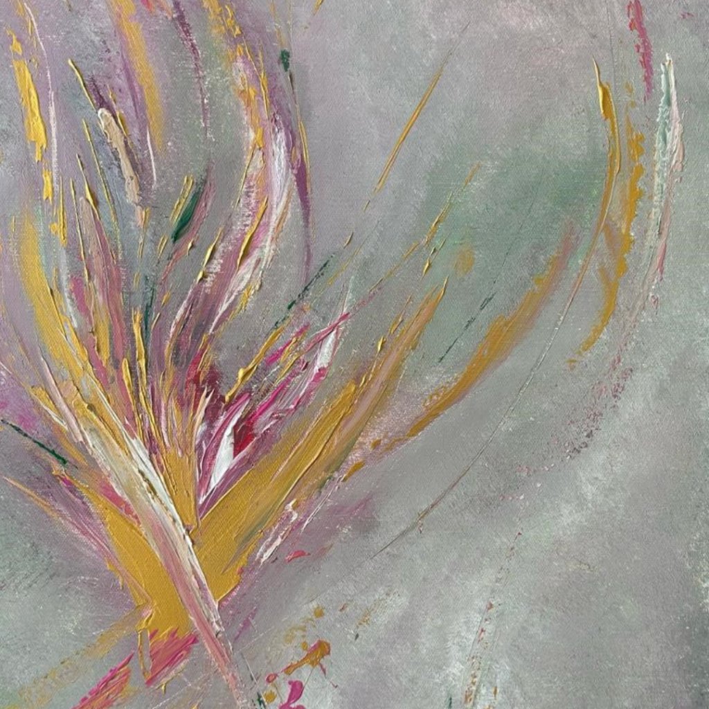 Obraz Krok vpřed je vizuálním ztělesněním pohybu, odvahy a probuzení vnitřní síly. Energetické tahy štětce v teplých tónech zlaté, růžové a zelené vystupují z jemného, téměř mlhavého pozadí jako symbol průlomu, naděje a nového začátku.