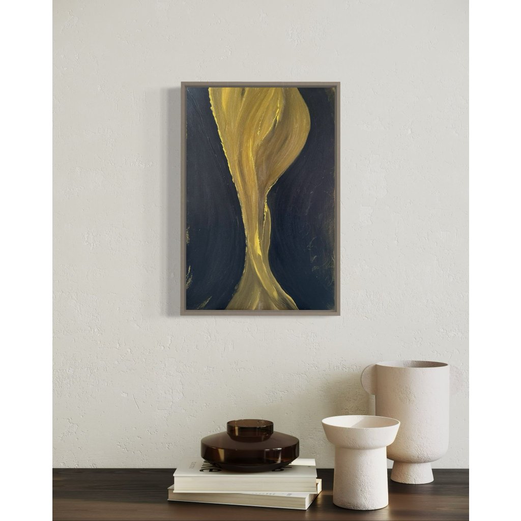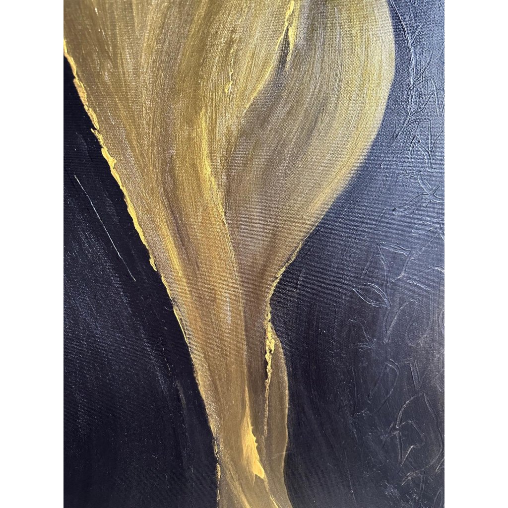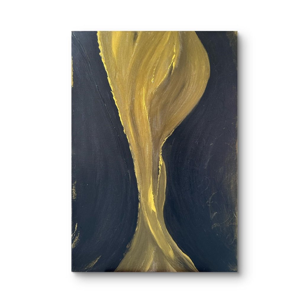 Obraz Ladná ztělesňuje ženskost v její nejčistší podobě – jemnost, sílu a harmonii v jednom plynulém tahu štětce. Zlatavá forma se elegantně vine temným pozadím, jako tančící silueta v šeru, která přitahuje pohled svou ladností i nejednoznačností.