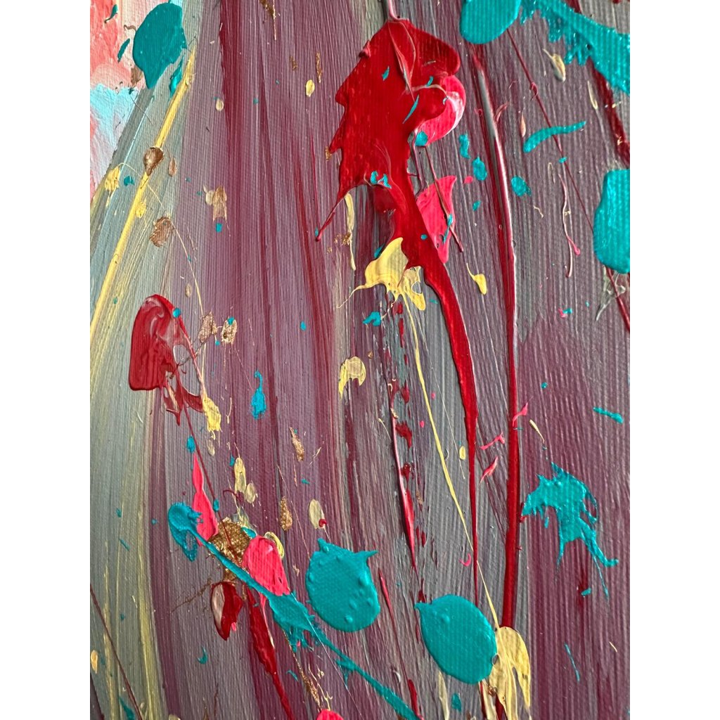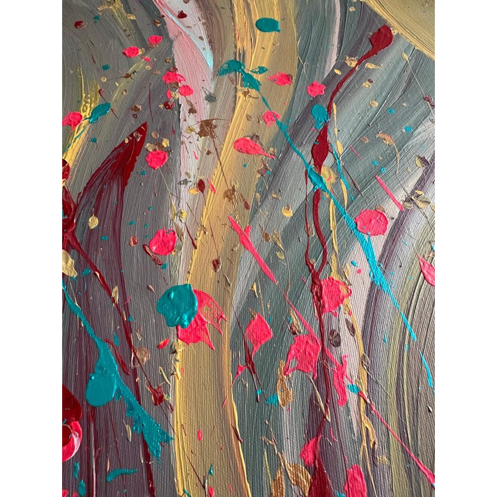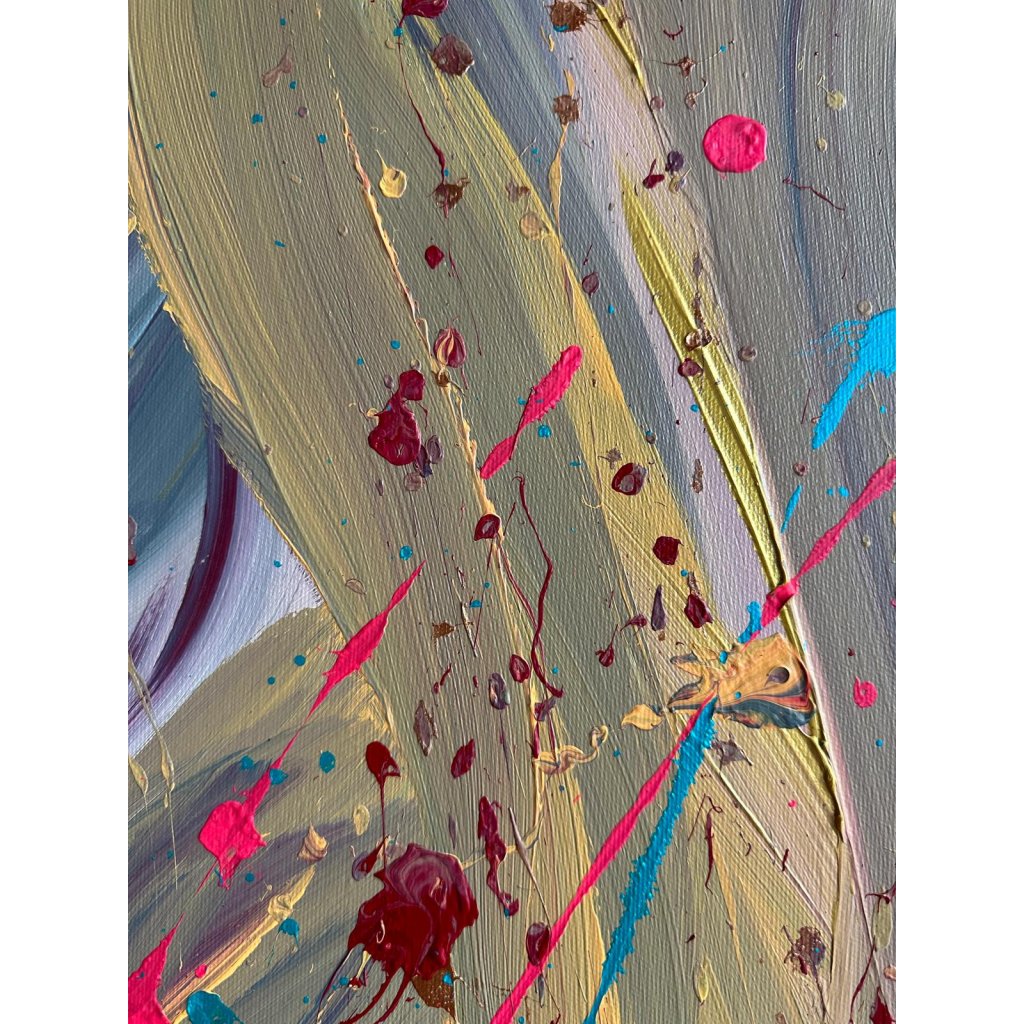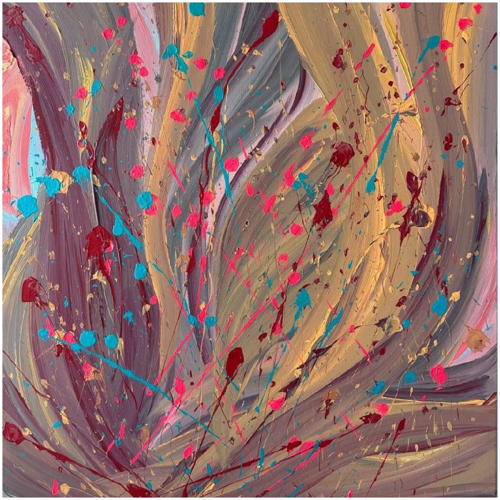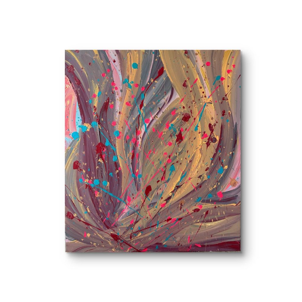 Obraz Letní louka je oslavou svobody, barev a pohybu. Energetické tahy štětce v teplých tónech zlaté, hnědé a purpurové vytvářejí podklad, ze kterého vyskakují živé stříkance modré, růžové a červené barvy – jako květy, které spontánně rozkvetly v letním vánku.