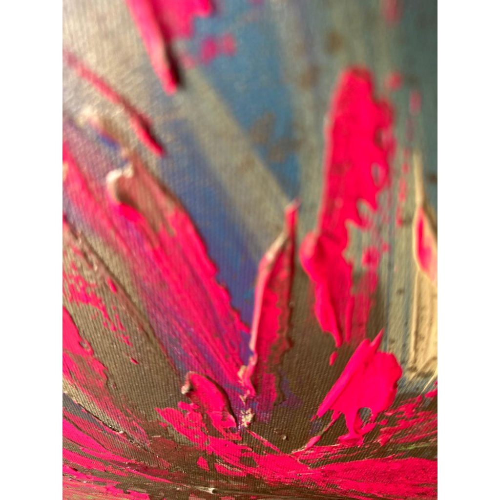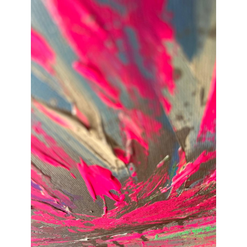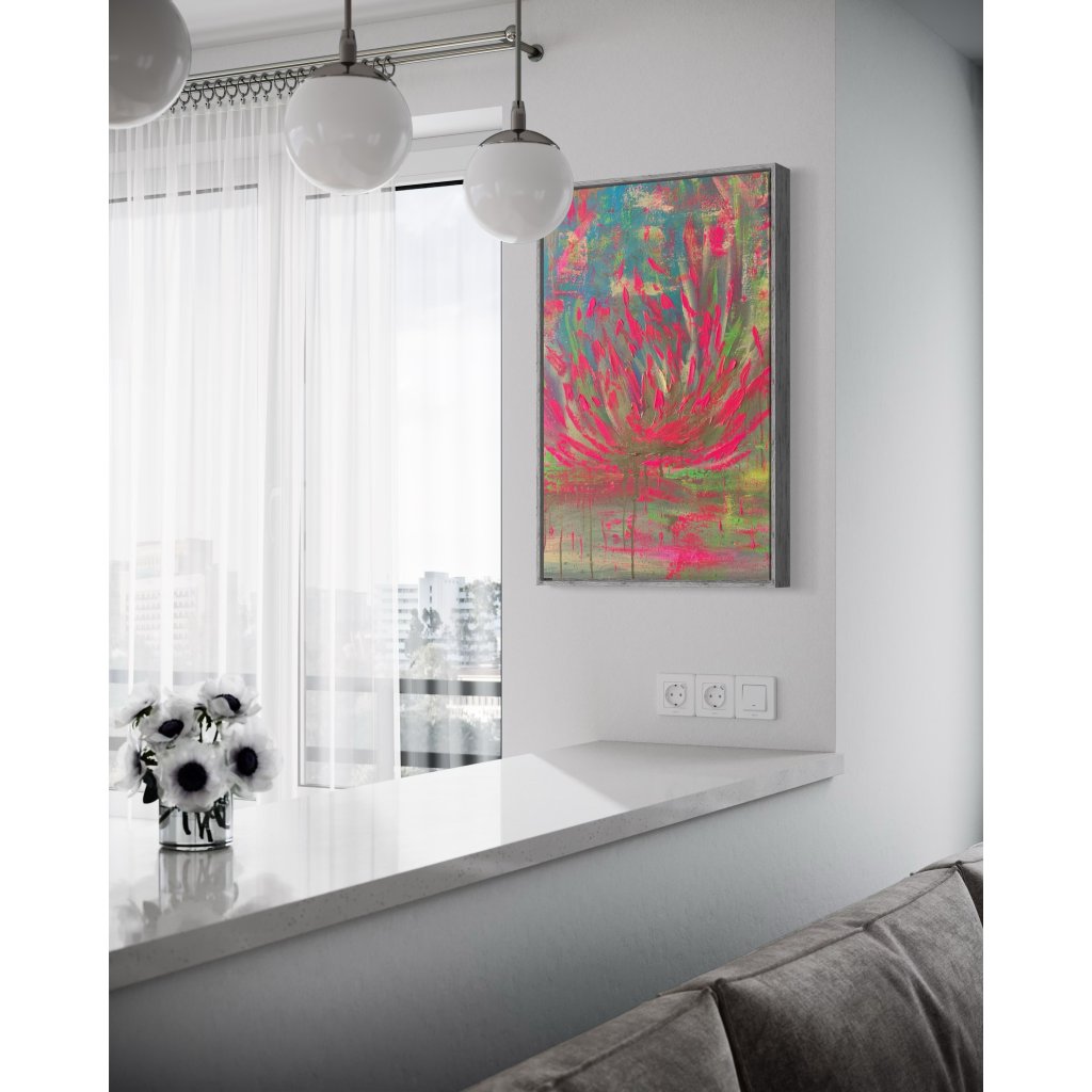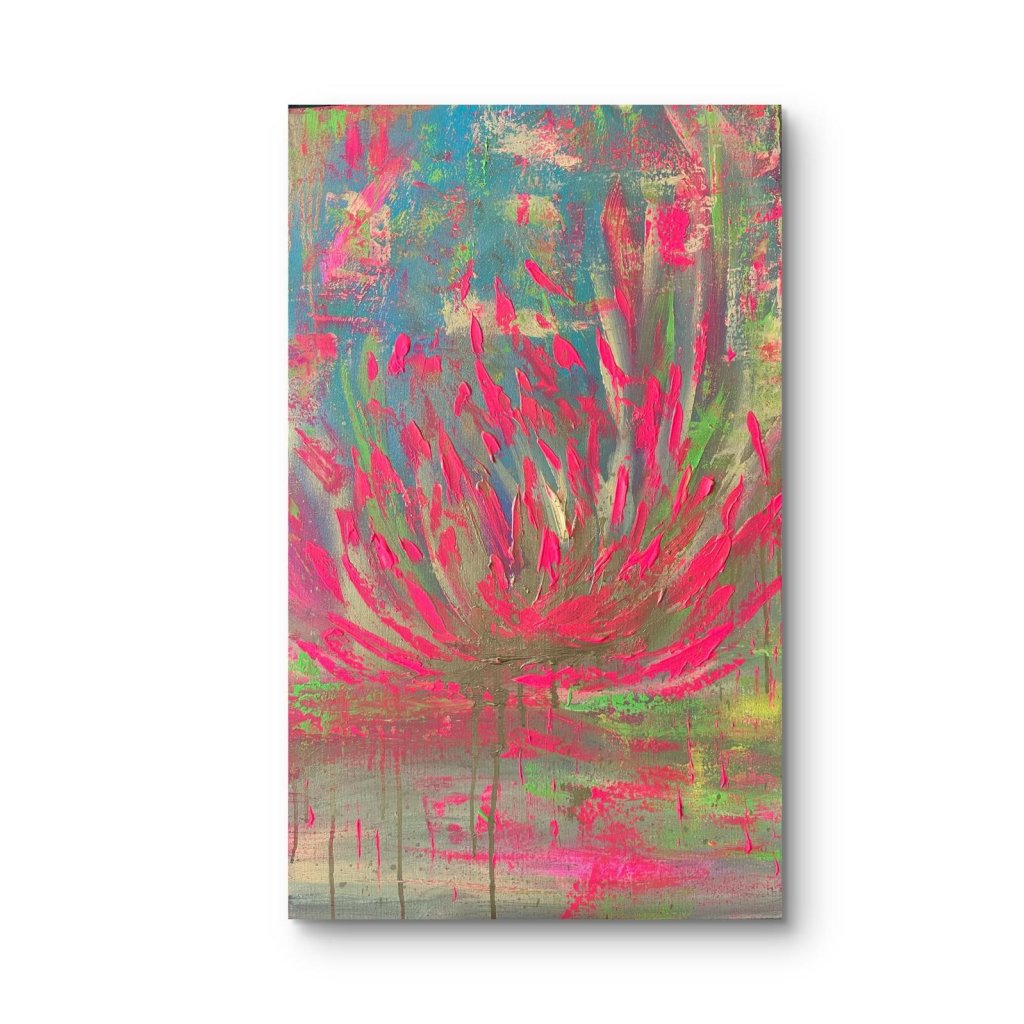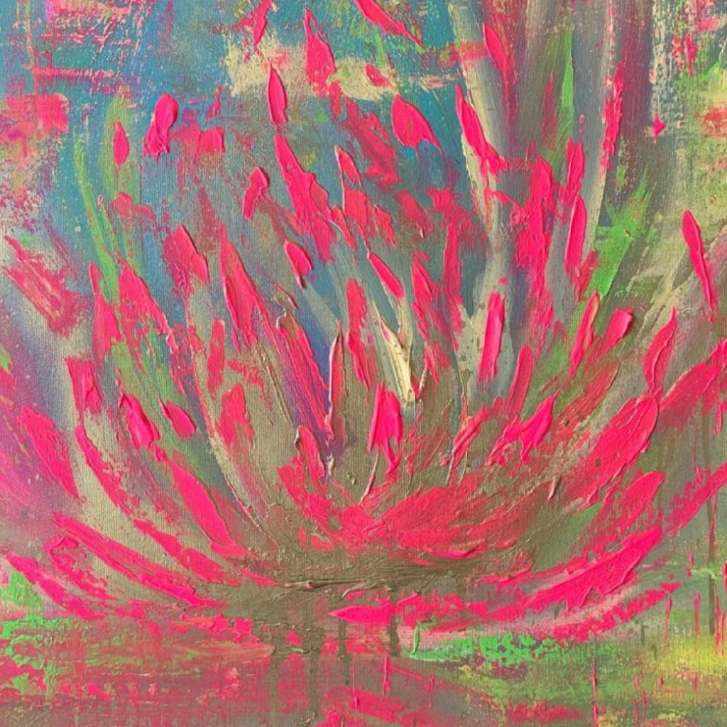 Expresivní abstraktní malba inspirovaná symbolem duchovní čistoty a znovuzrození. Výrazné růžové tahy v kontrastu s živým barevným pozadím evokují sílu, něhu i klid pohybu - jako lotos, který vyrůstá z kalných vod a směřuje ke světlu.