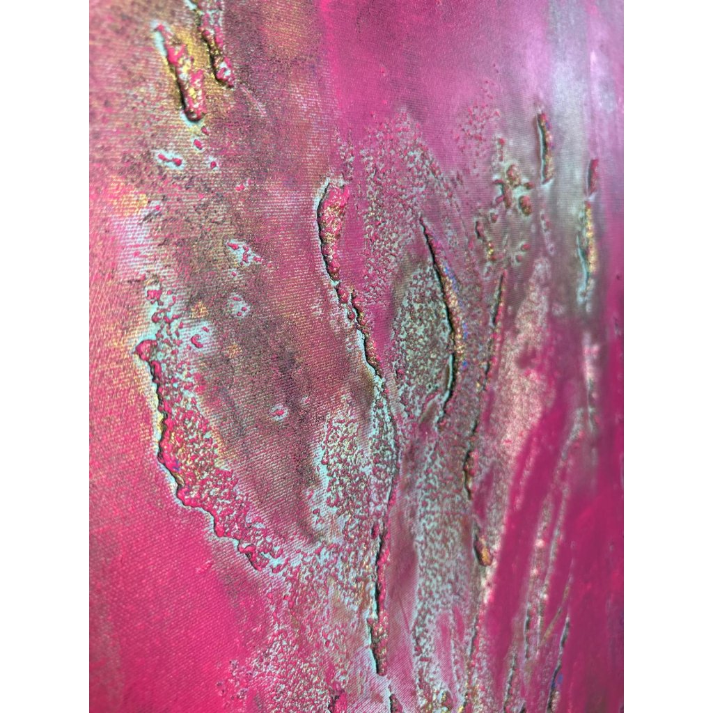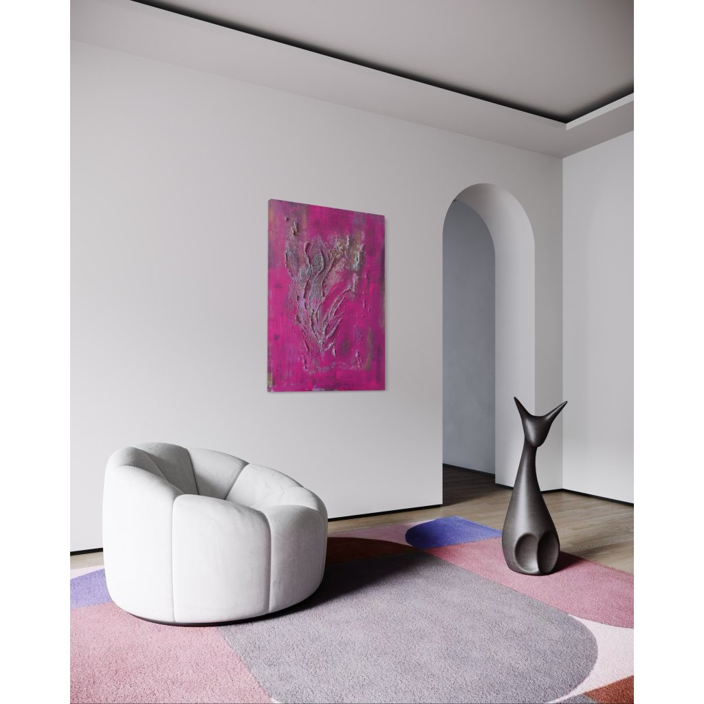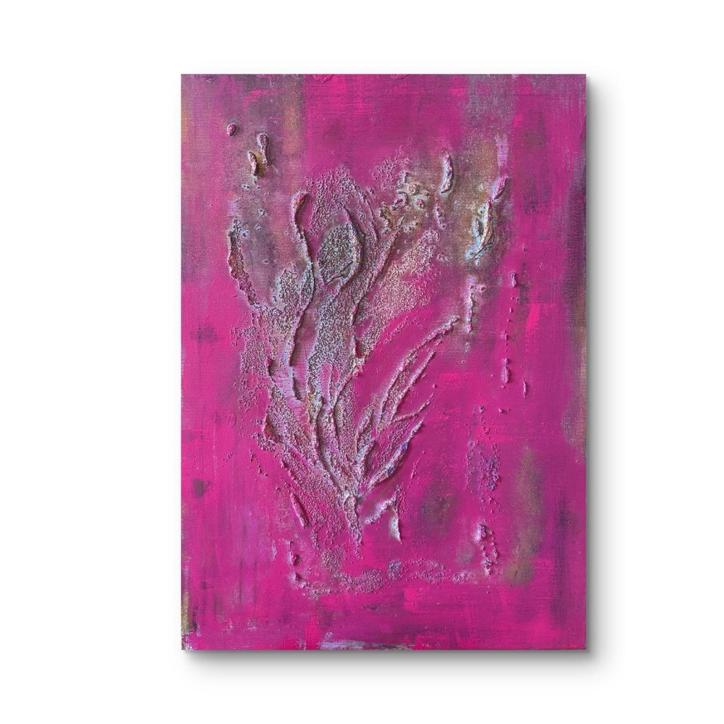Obraz Mávnutí křídly zaujme sytou magentovou barvou, která působí jako zářivý výbuch energie. Z plátna vystupuje plastická textura připomínající pohyb – snad jemné rozevření křídel, víření vzduchu, dotek neviditelné bytosti. Reliéfní linie evokují plynulost, ladnost i křehkost zároveň.