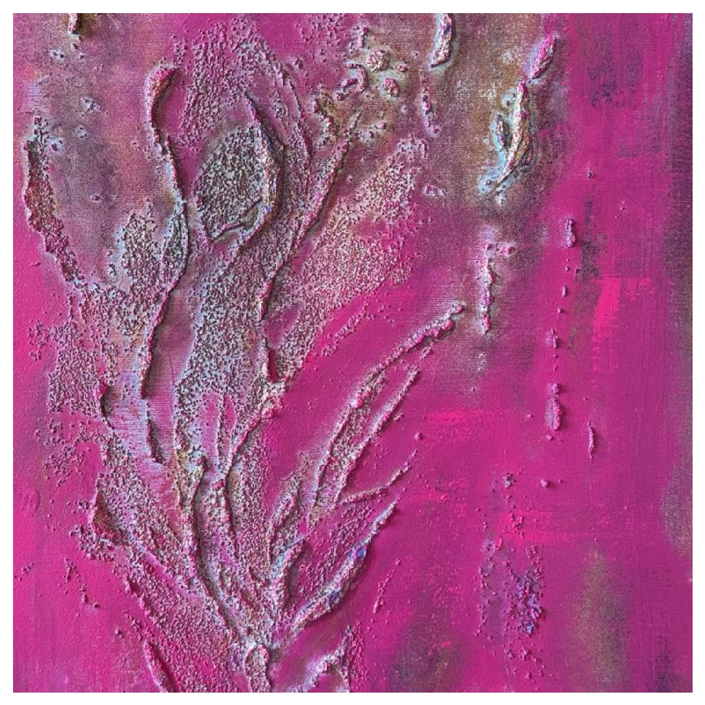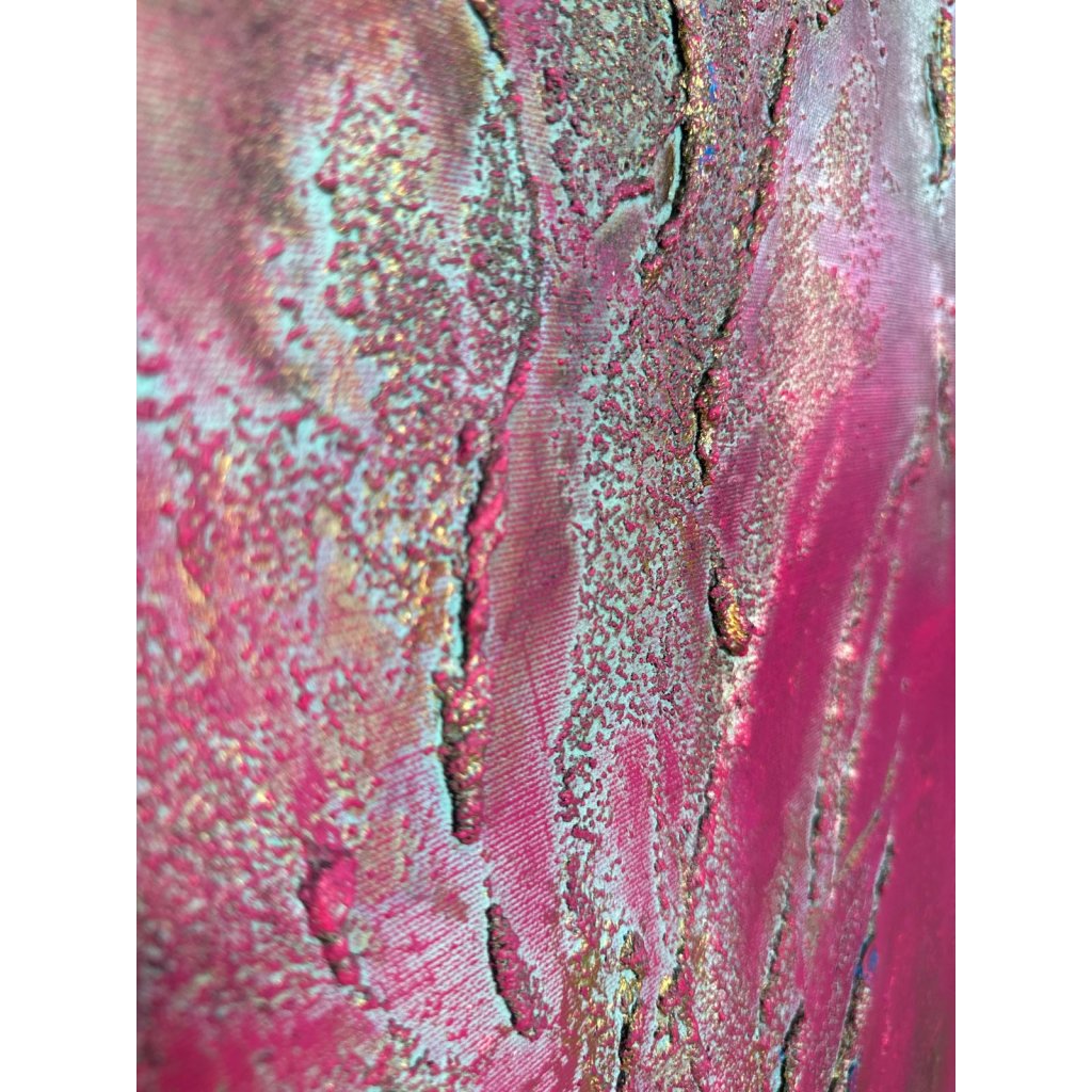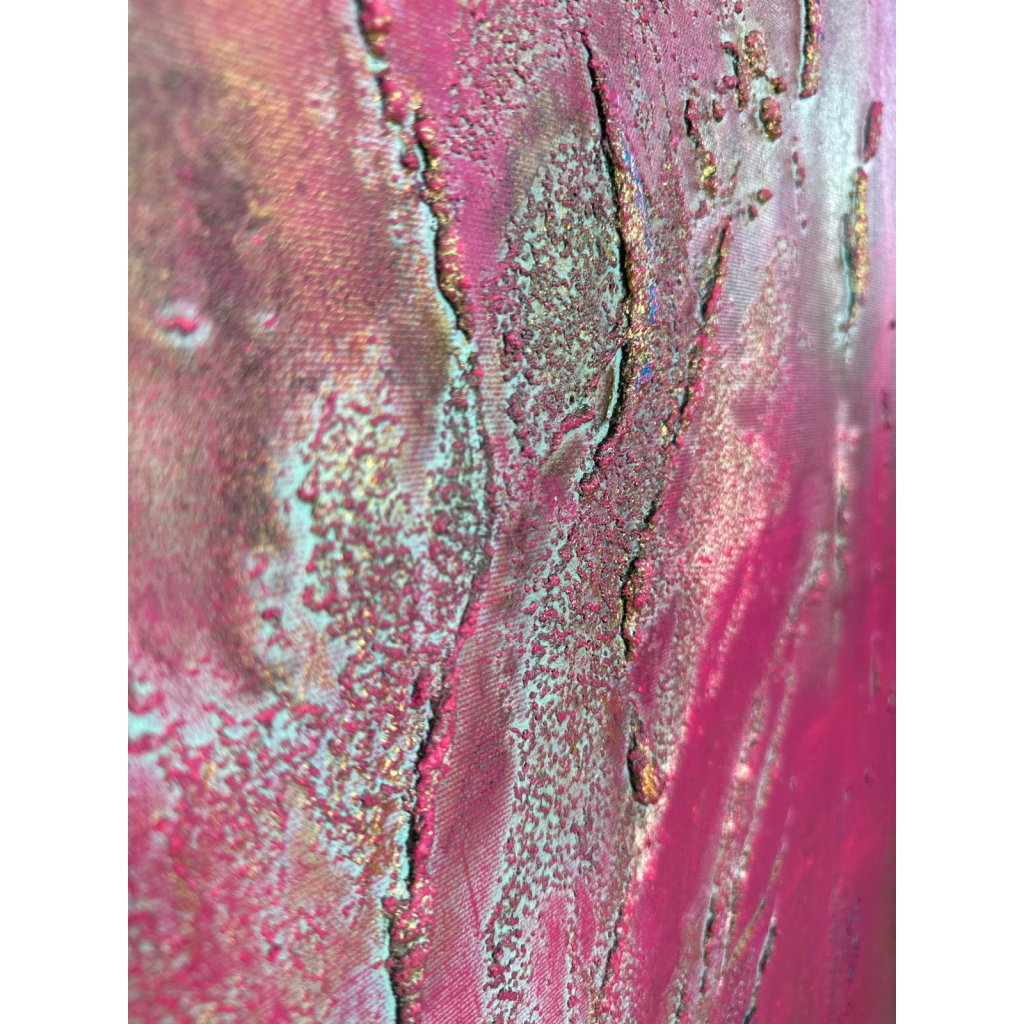 Obraz Mávnutí křídly zaujme sytou magentovou barvou, která působí jako zářivý výbuch energie. Z plátna vystupuje plastická textura připomínající pohyb – snad jemné rozevření křídel, víření vzduchu, dotek neviditelné bytosti. Reliéfní linie evokují plynulost, ladnost i křehkost zároveň.