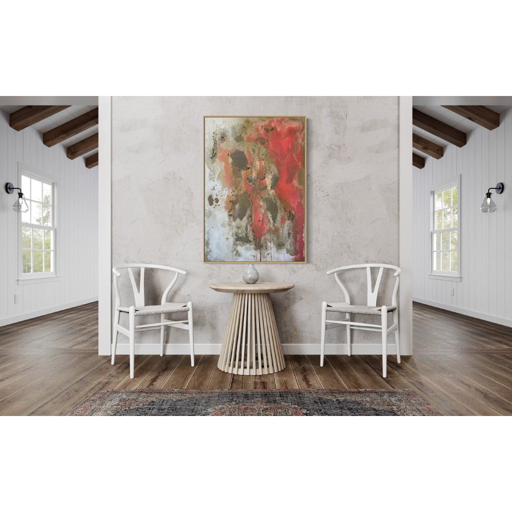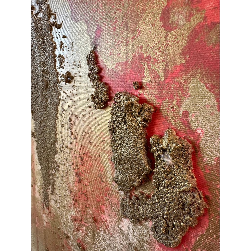 Struktura plátna není jen vizuálním prvkem – vybízí k dotyku, vnímání kontrastu mezi hladkým a hrubým, mezi pomíjivým světlem a věčnou hmotou. Tento obraz působí jako fragment krajiny, která prošla časem i živly, a přináší do prostoru klid i napětí zároveň.