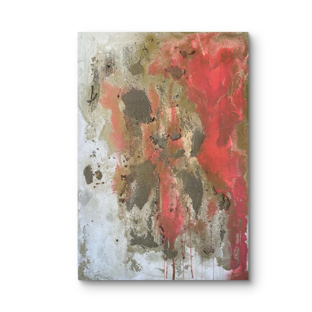 Nebeské červánky jsou syrovým vyjádřením síly přírody a pomíjivé krásy okamžiku, kdy se den mění v noc. Kombinace sytě červených a zemito-šedých tónů připomíná krvavé nebe zalité zapadajícím sluncem, zatímco hrubé textury vytvořené modelační hmotou a pískem přidávají obrazu fyzickou hloubku a surovost.