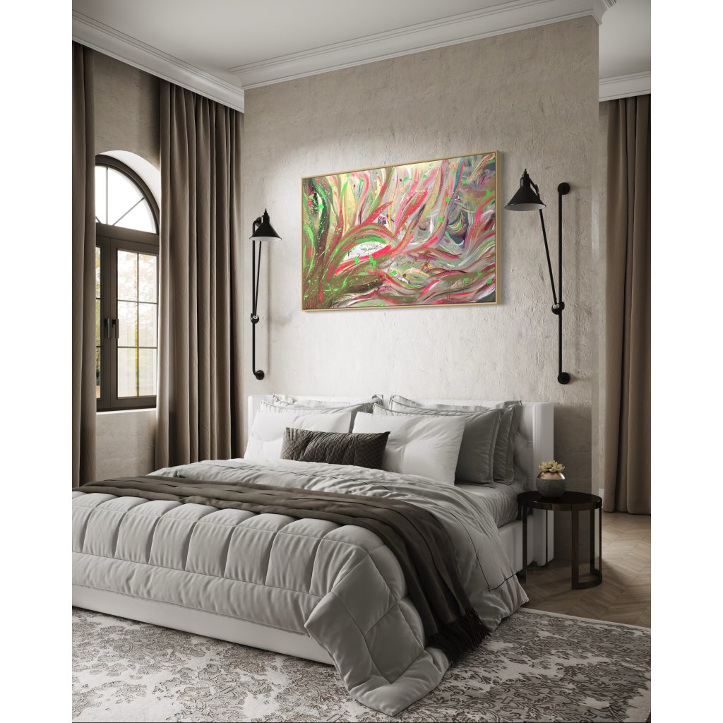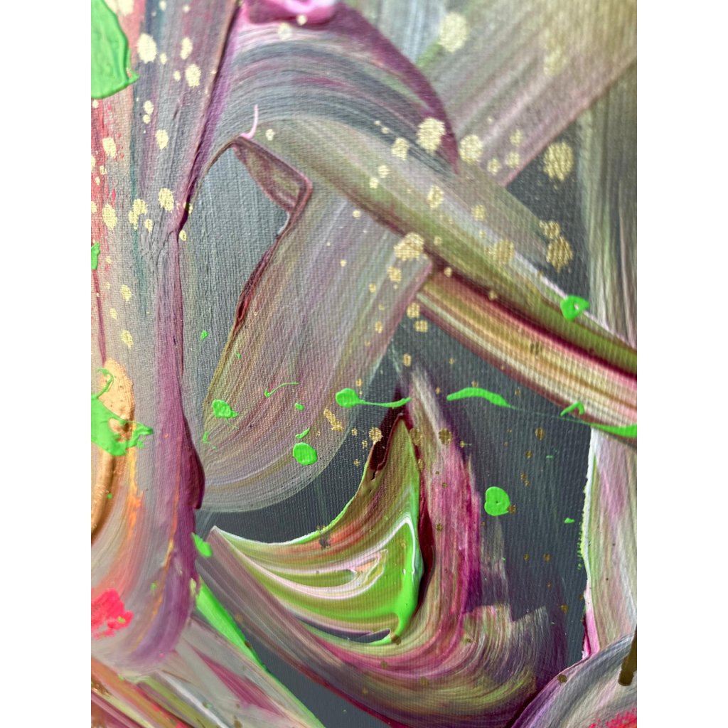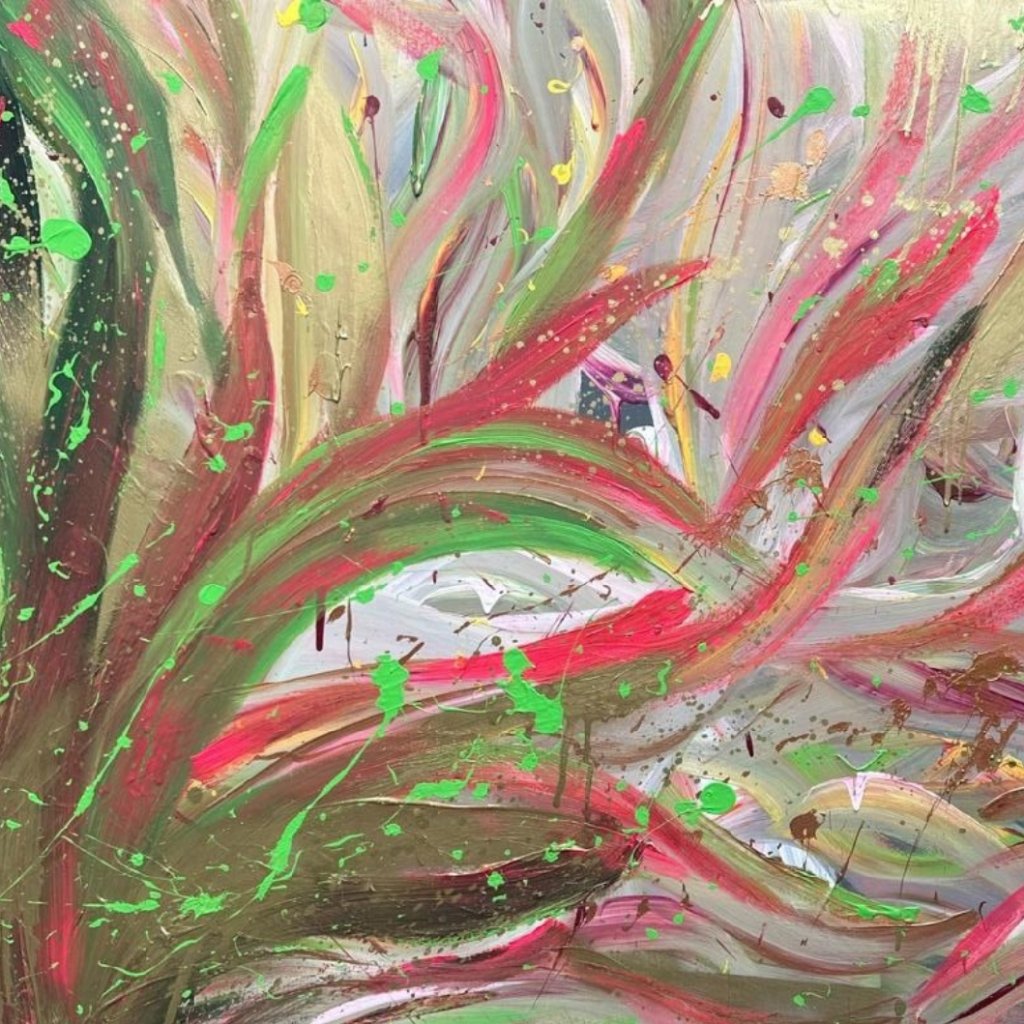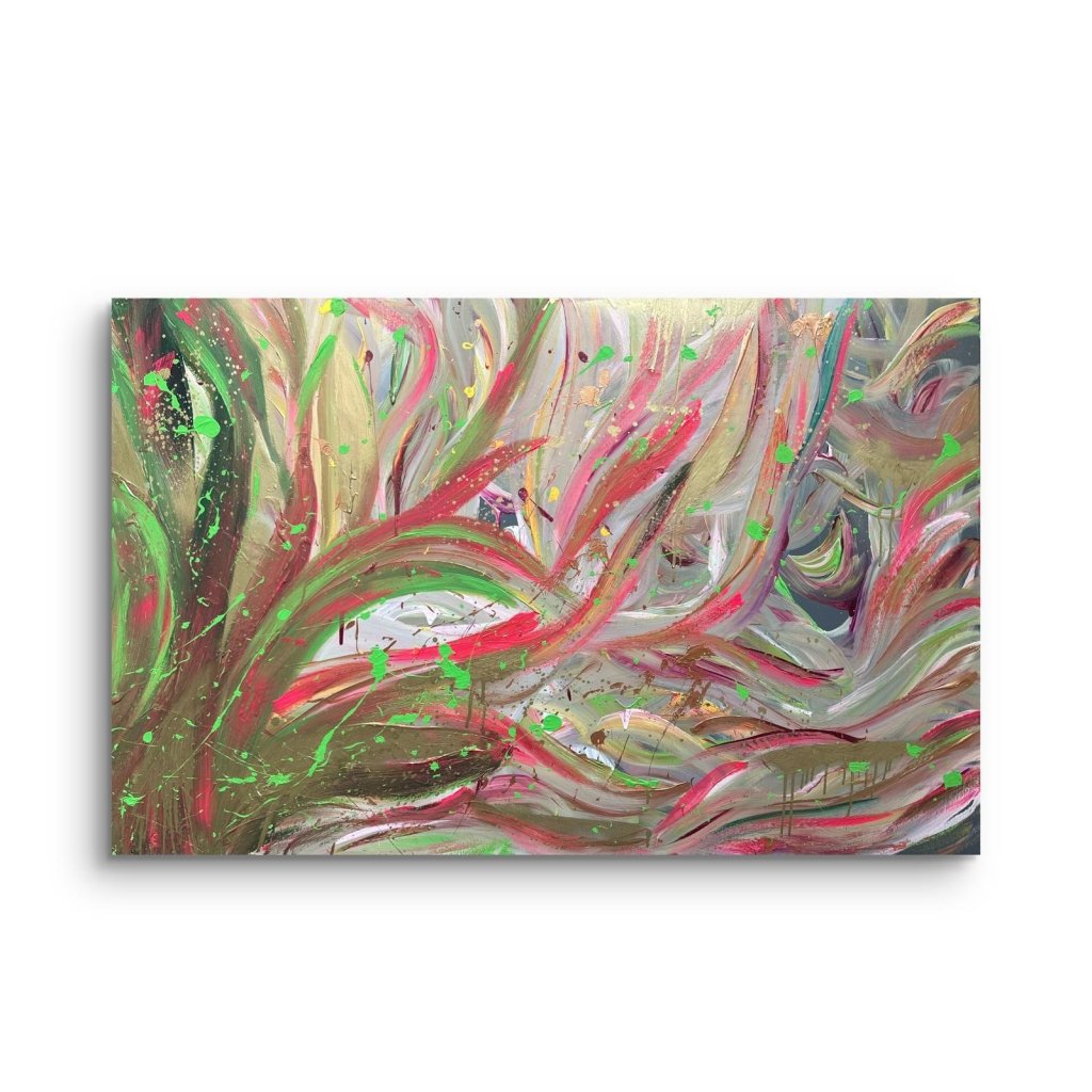 Obraz Rio přináší explozivní proud energie a pohybu inspirovaný temperamentem a živostí brazilského města. Dynamické tahy štětce v odstínech růžové, zelené, zlaté a hnědé vytvářejí dojem divoké přírody, karnevalové atmosféry a nekonečného toku řeky života. Neonové akcenty dodávají kompozici moderní pulz a odkazují na noční světla města.