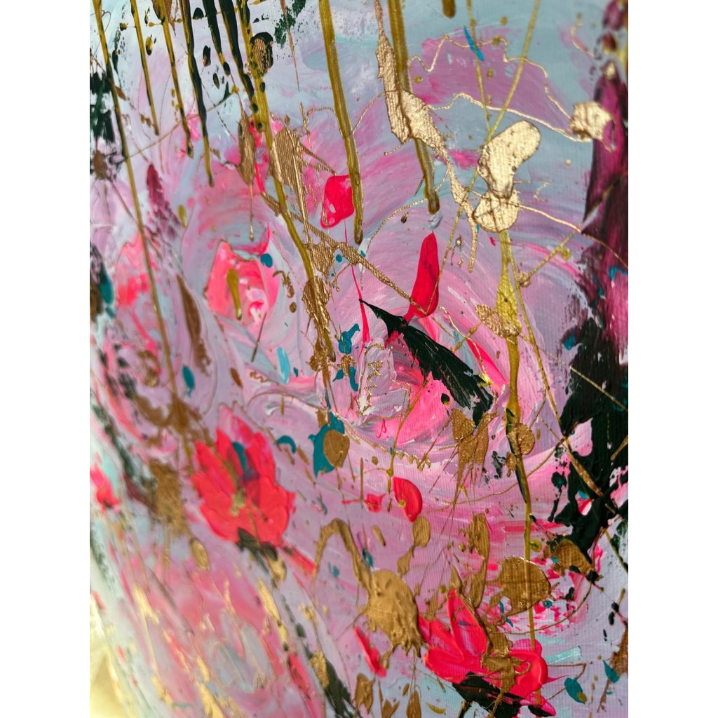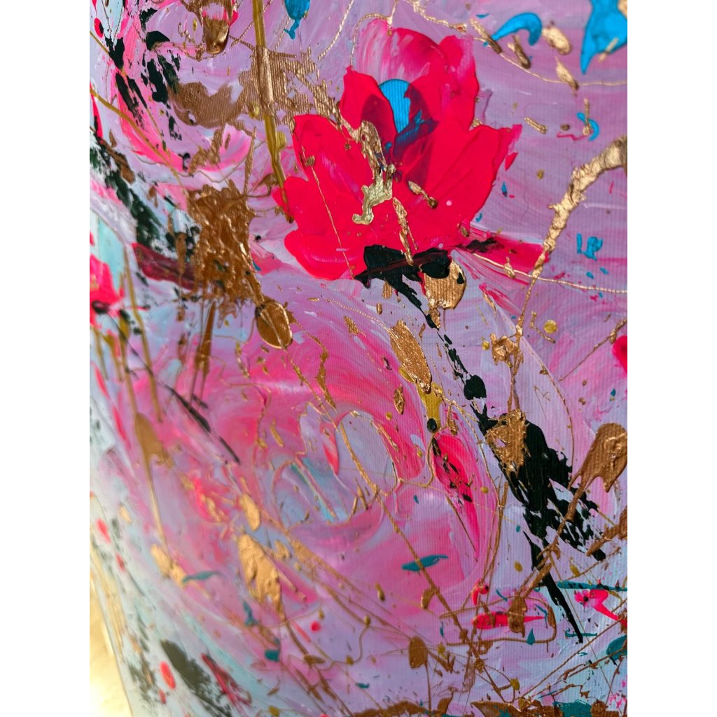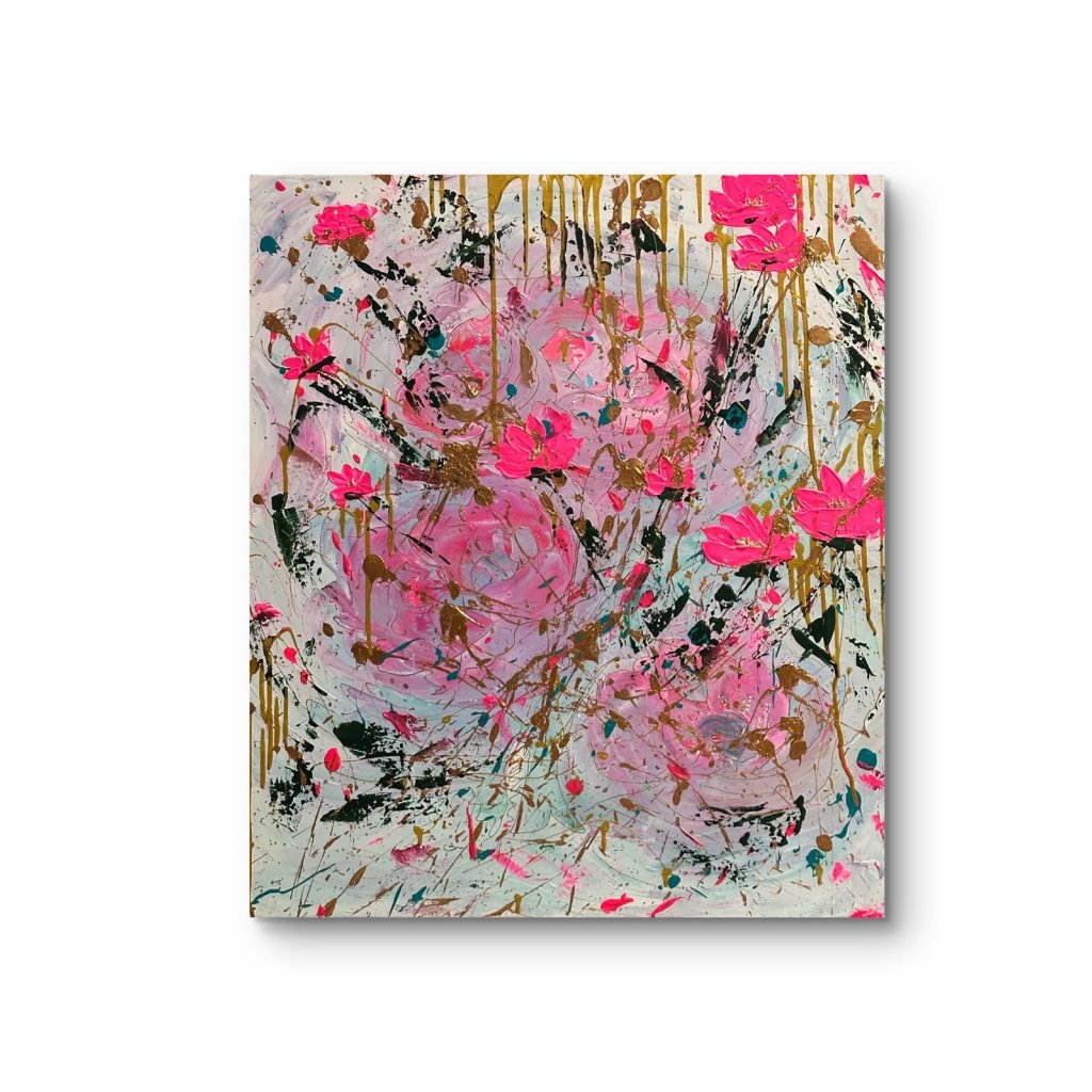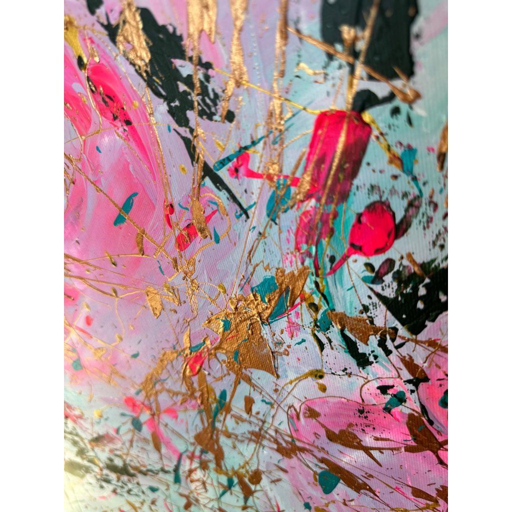 Obraz Růže je oslavou ženskosti, jemnosti a vášně. V abstrahované květinové kompozici se prolínají odstíny růžové a zlaté s expresivní energií černých a tyrkysových akcentů. Výrazné tahy a cákance vytvářejí dynamický kontrast mezi krásou růžových květů a syrovostí volného výtvarného gesta.
