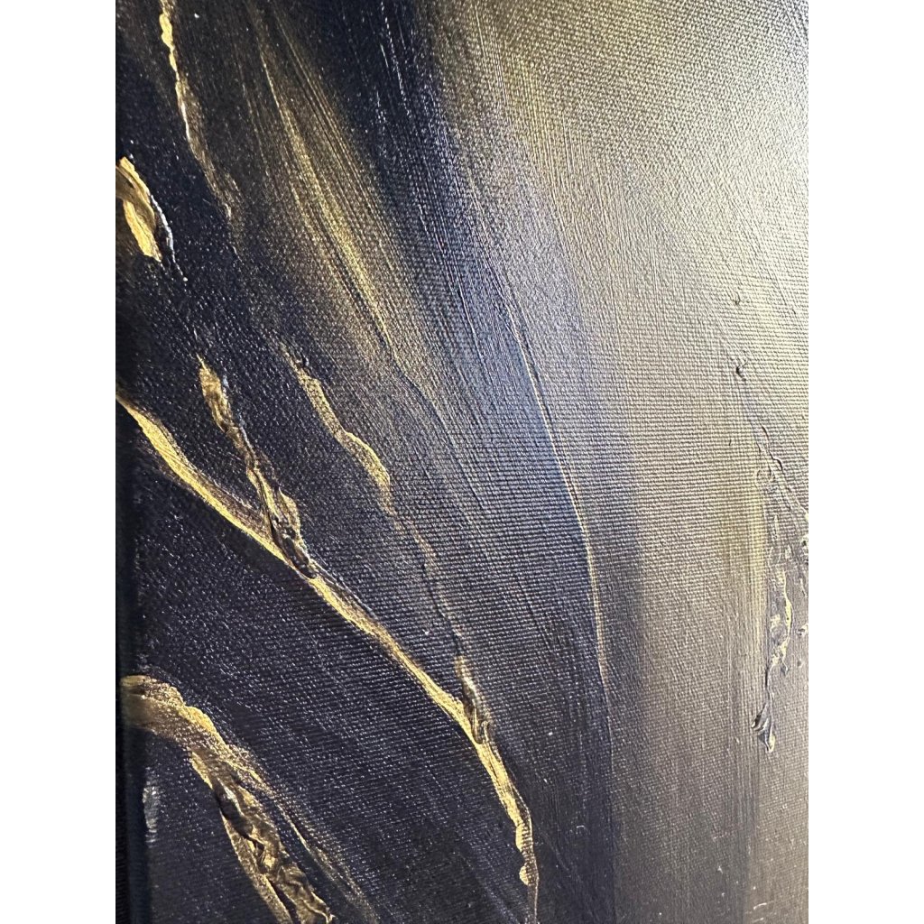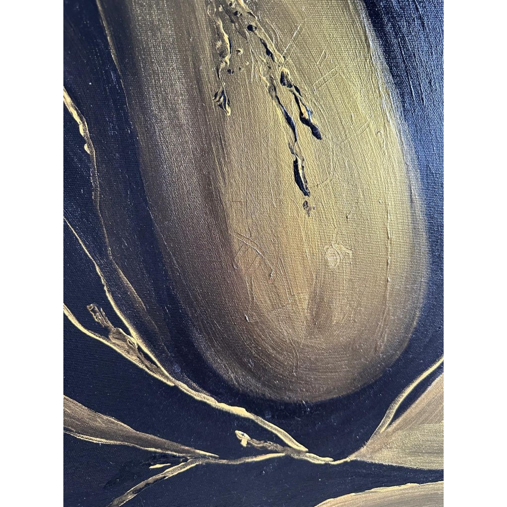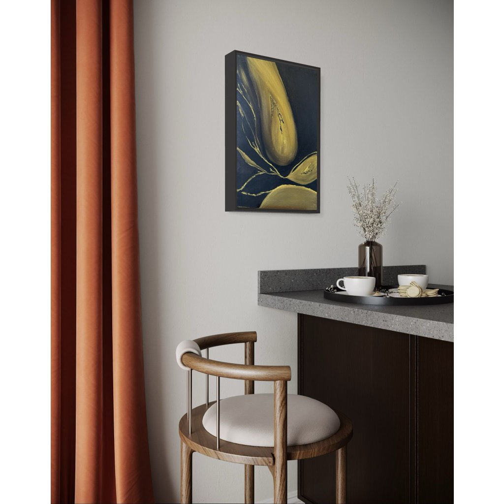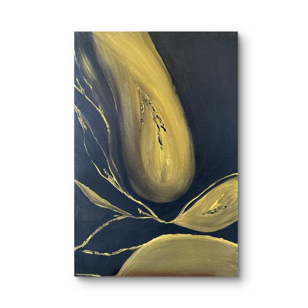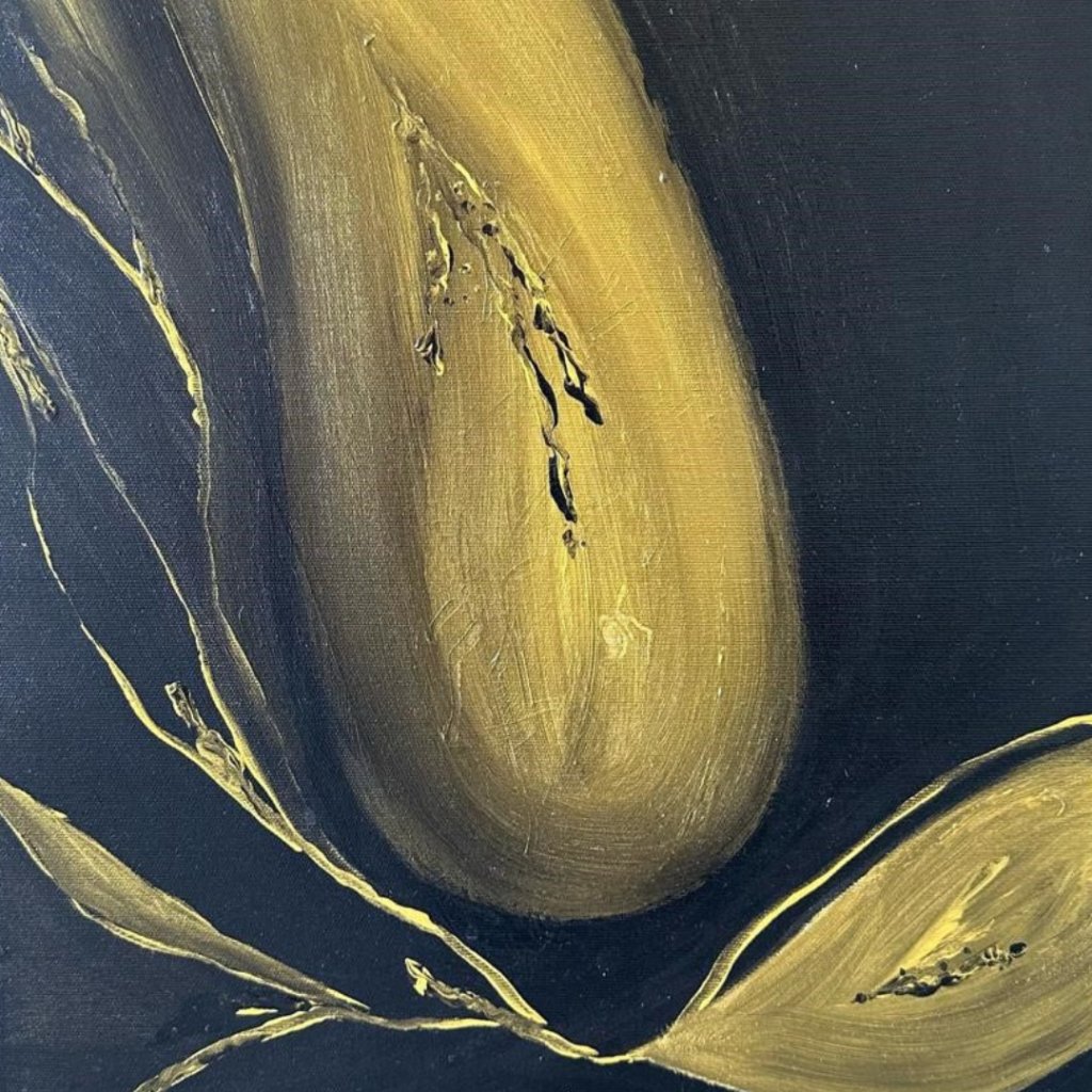 Splynutí je obrazem hluboké harmonie a vzájemného pronikání. Zlatavé organické tvary, plynule propojené na temném pozadí, vytvářejí dojem tiché symbiózy – jako by se jednotlivé elementy sjednocovaly v jeden celek.
