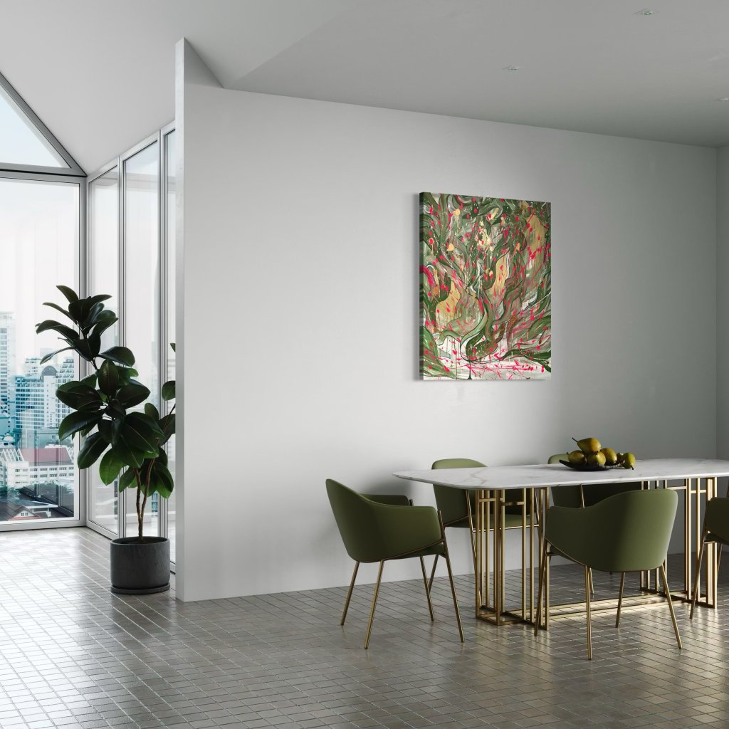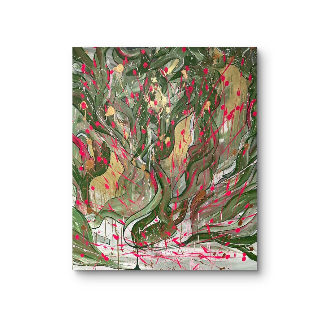 Obraz Strom naděje je vizuální metaforou síly, růstu a znovuzrození. Dominantní zelené tahy připomínají bujnou korunu stromu, který se rozrůstá do všech směrů, zakořeněn v zemi, ale neustále směřující vzhůru. Zlaté akcenty vnášejí do obrazu pocit světla a naděje – jako paprsky, které pronikají listovím.