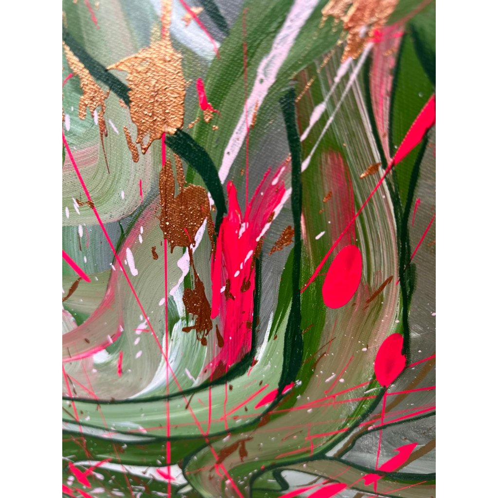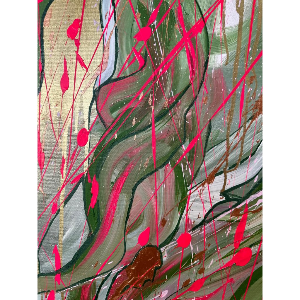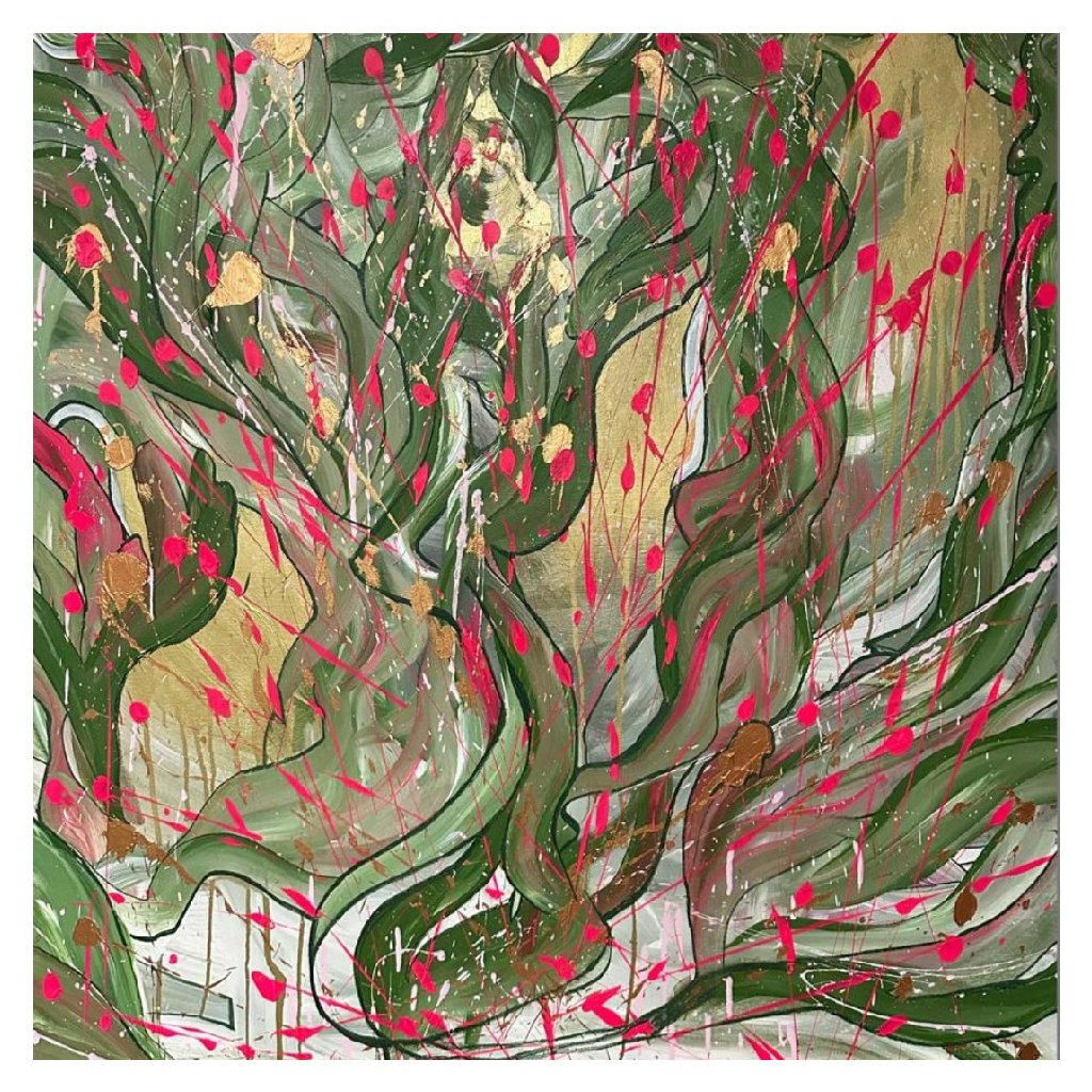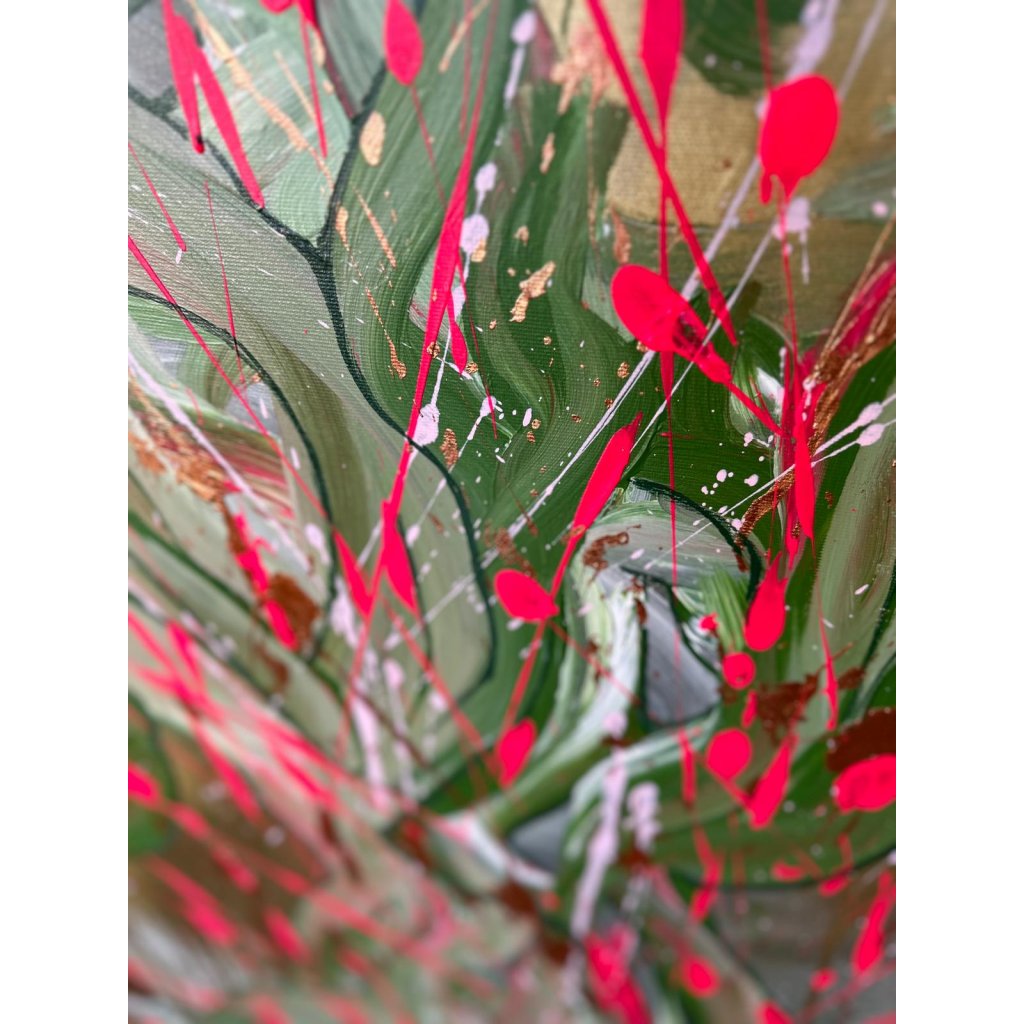 Rytmické šplíchance sytě růžové barvy narušují klid zelené krajiny a dodávají obrazu energii, pohyb a odvahu. Tato barevná kombinace symbolizuje vnitřní sílu a odolnost – schopnost nacházet krásu a víru i v náročných obdobích.