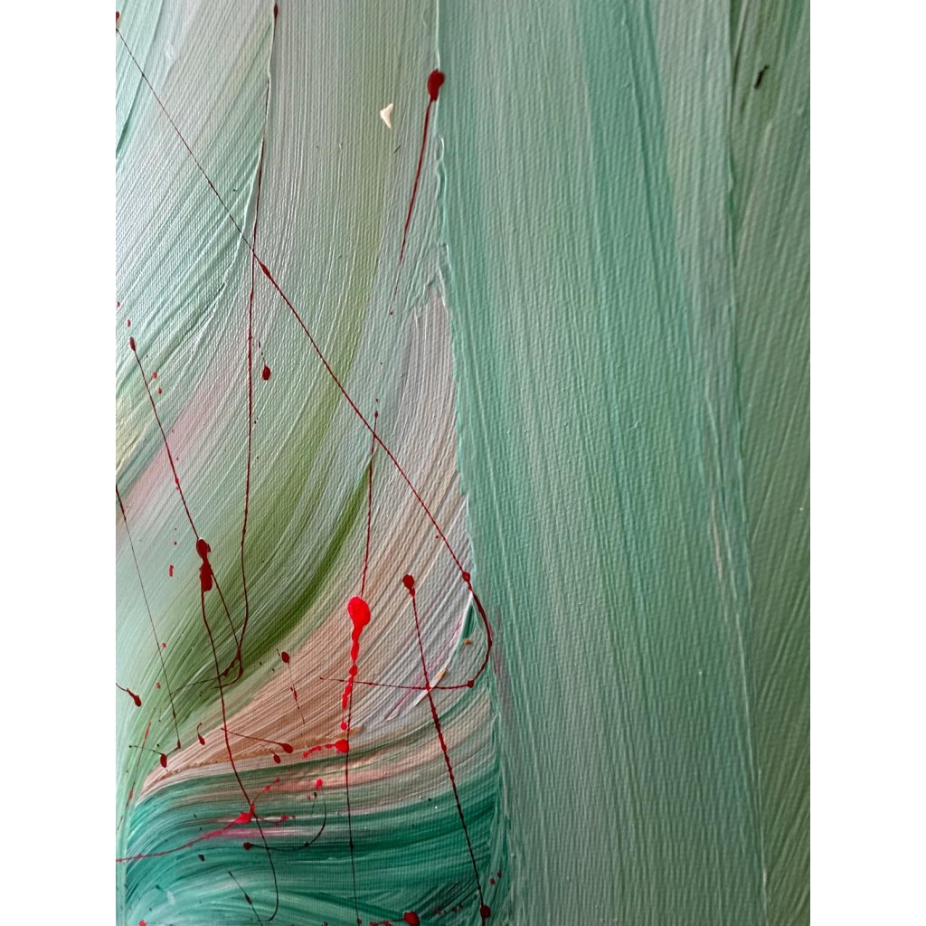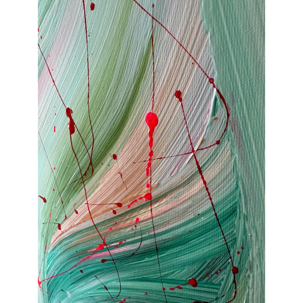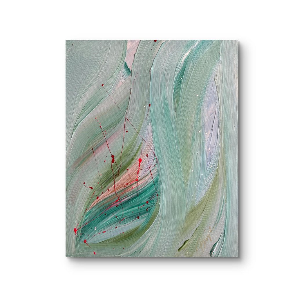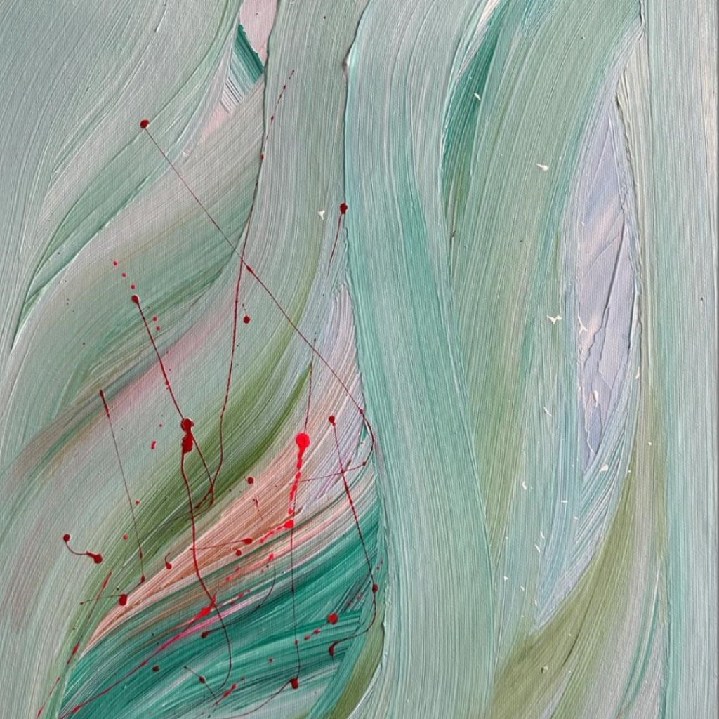 Obraz Svět víl v sobě nese lehkost, snovost a kouzlo neviditelných světů. Jemné tahy štětce v odstínech zelené, tyrkysové a pastelově růžové připomínají závoj tajemství, který se vlní v rytmu přírody. Červené kapky a linky působí jako magické jiskry – jako stopy pohybu víl tančících v lesním šeru.