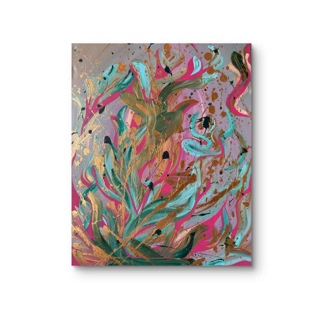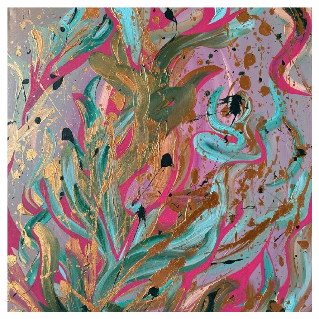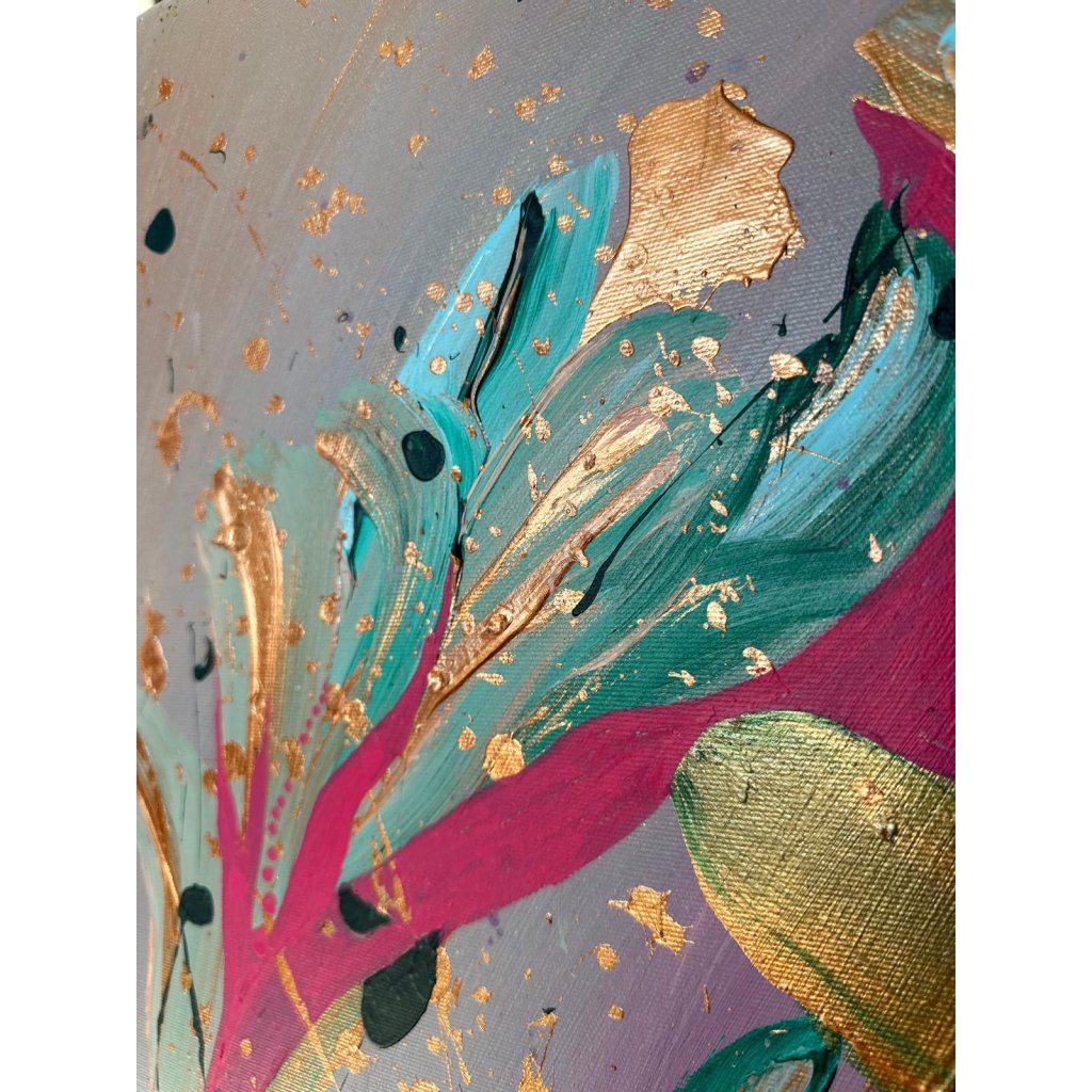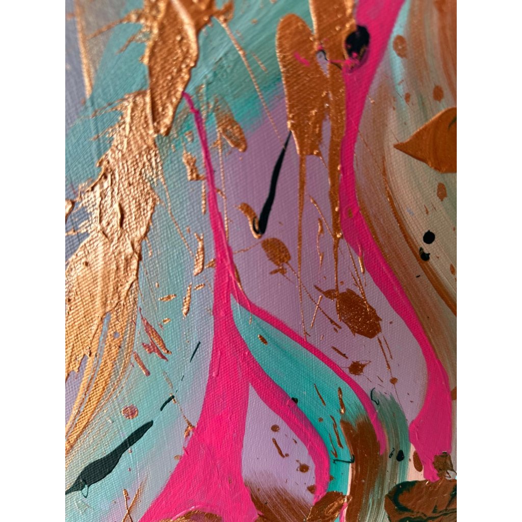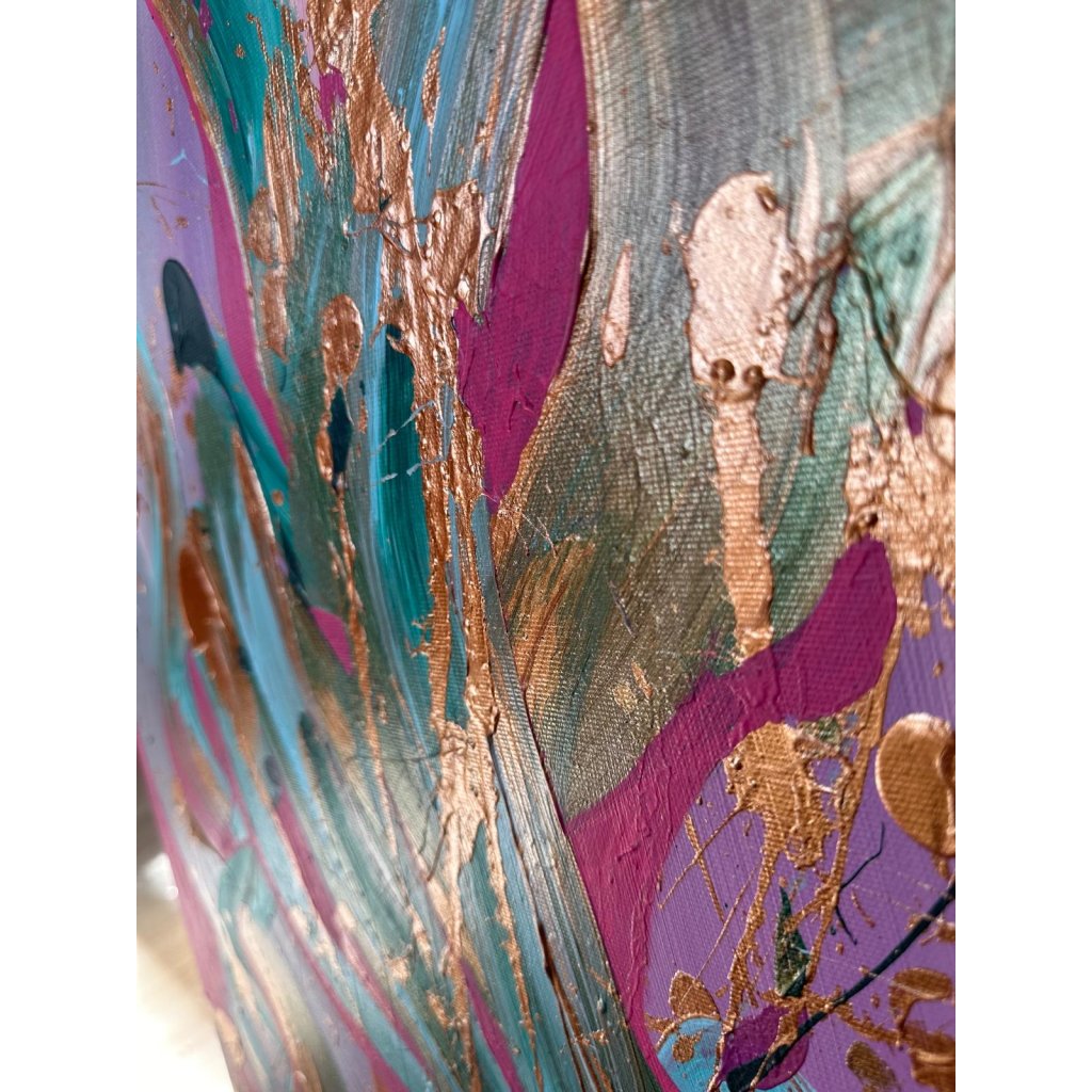 Obraz Tajemství nás dvou je vizuálním záznamem hlubokého a intimního propojení dvou duší. Abstraktní kompozice s výraznými tahy v tyrkysové, růžové a zlaté barvě na jemném fialovém podkladu působí jako tanec emocí – od jemnosti po vášeň, od harmonie po tajemství. Zlaté prvky dodávají dílu slavnostní a téměř mystický rozměr, zatímco kontrastní černé akcenty naznačují skryté vrstvy vztahu.
