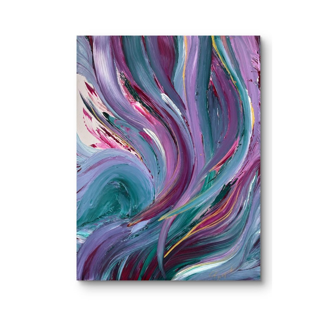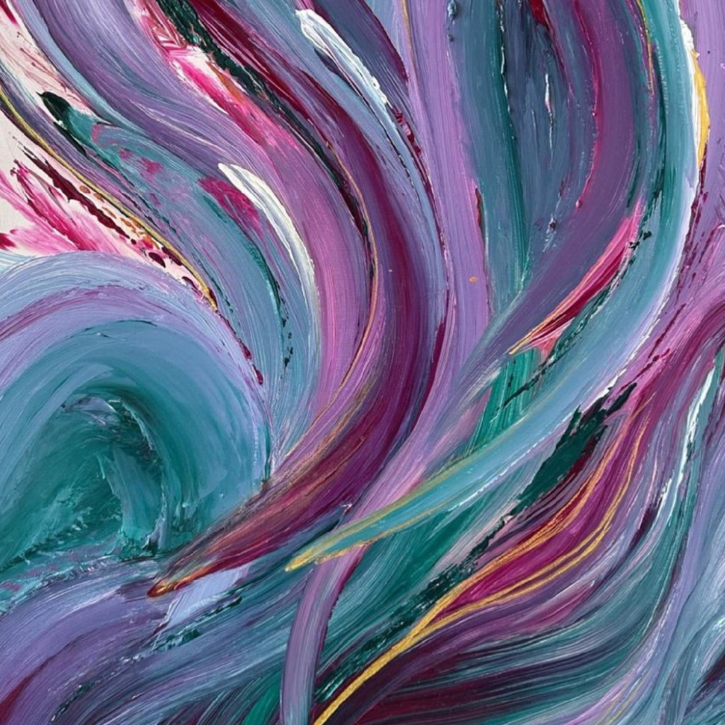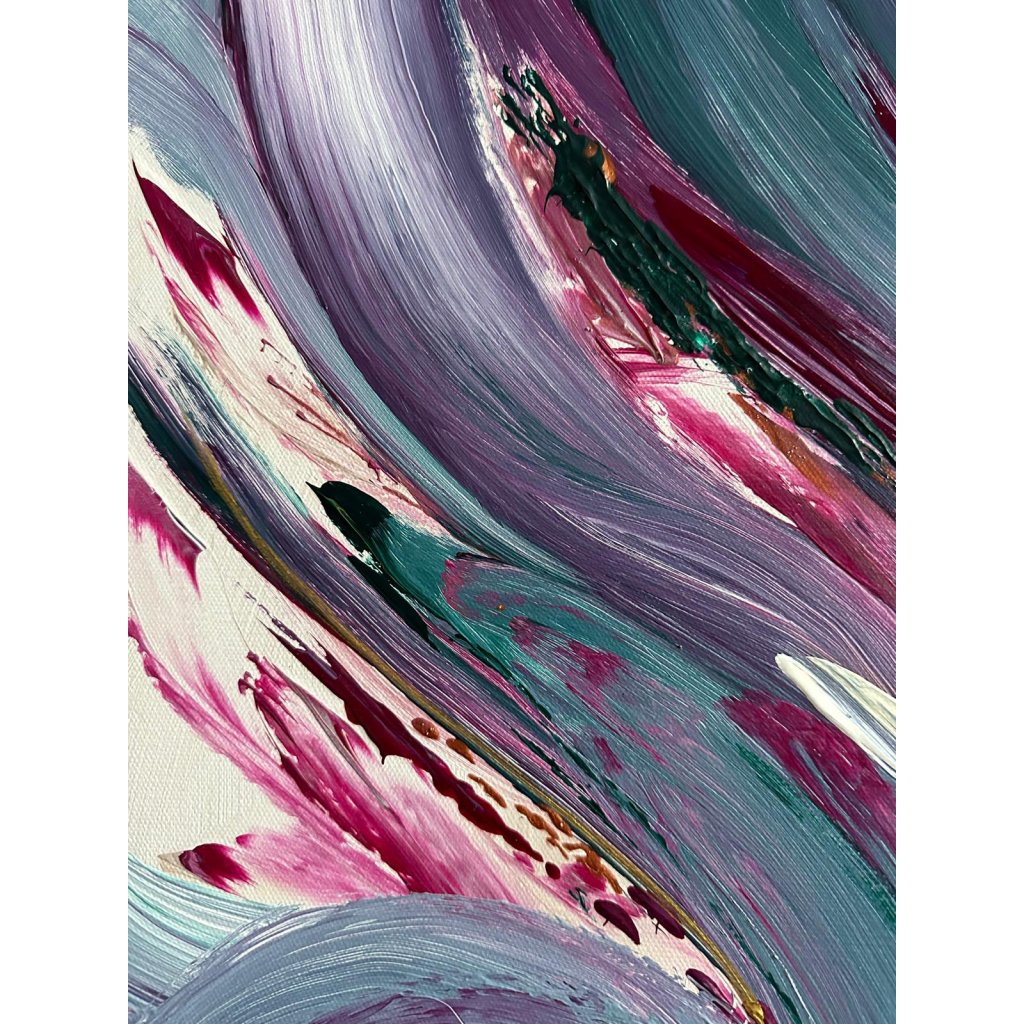Obraz V hlubinách vás vtáhne do světa plynulých pohybů a tajemné energie, připomínající proudy oceánu či víry vnitřních emocí. Dynamické tahy štětcem v odstínech fialové, tyrkysové, vínové a smetanové barvy se prolínají jako proudy vody – někdy klidné, jindy divoké.