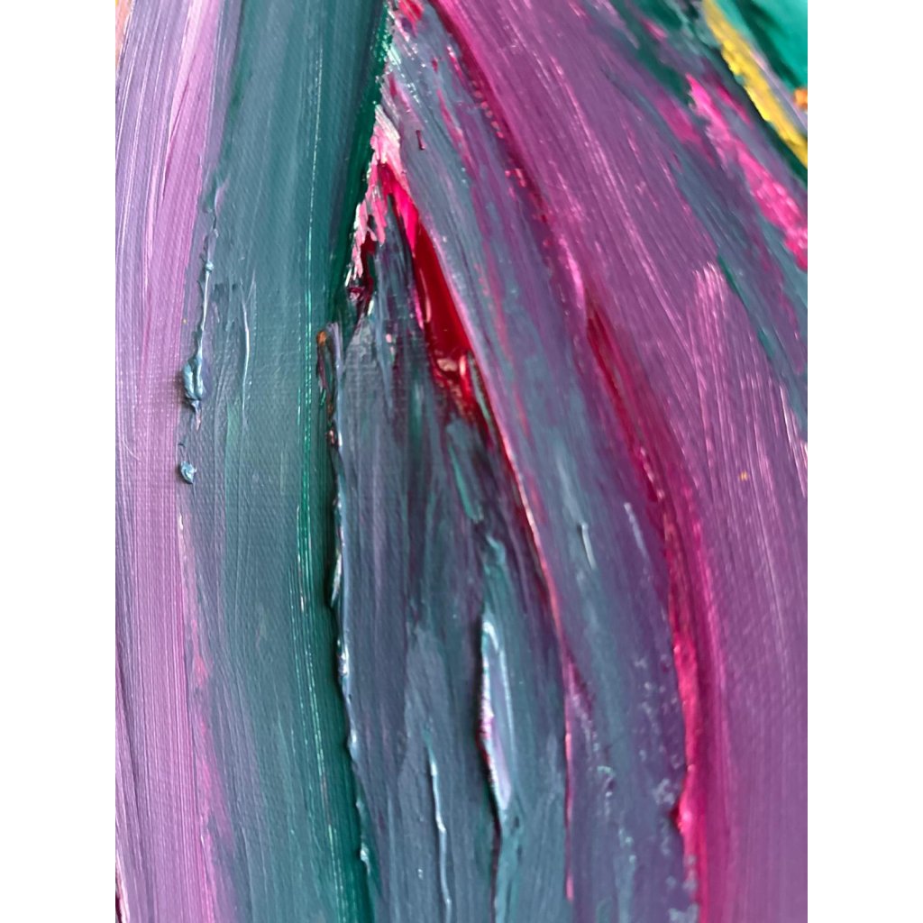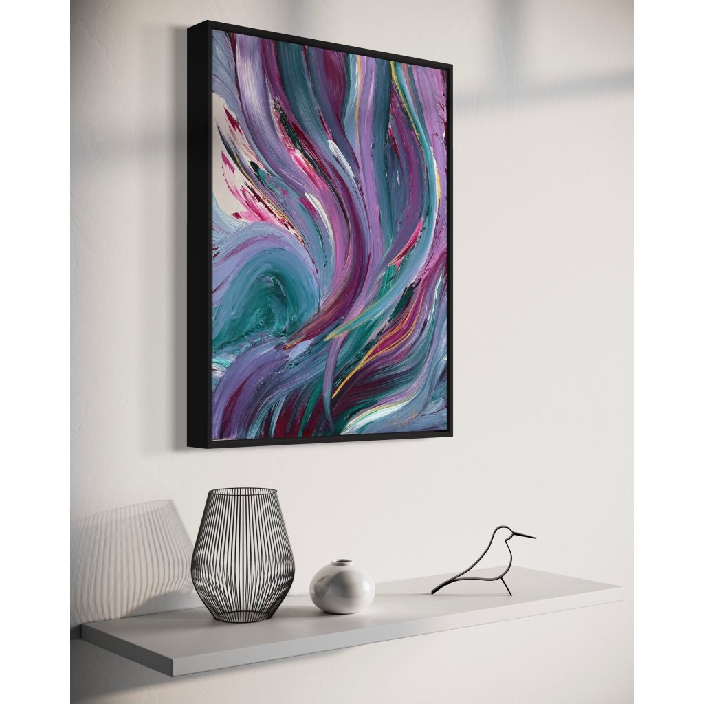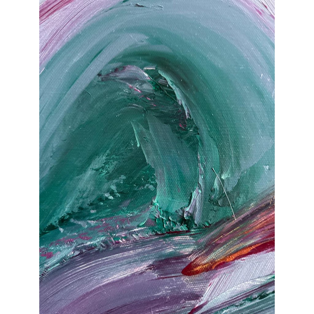 Obraz V hlubinách vás vtáhne do světa plynulých pohybů a tajemné energie, připomínající proudy oceánu či víry vnitřních emocí. Dynamické tahy štětcem v odstínech fialové, tyrkysové, vínové a smetanové barvy se prolínají jako proudy vody – někdy klidné, jindy divoké.