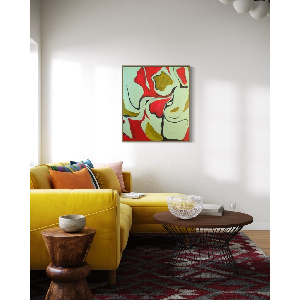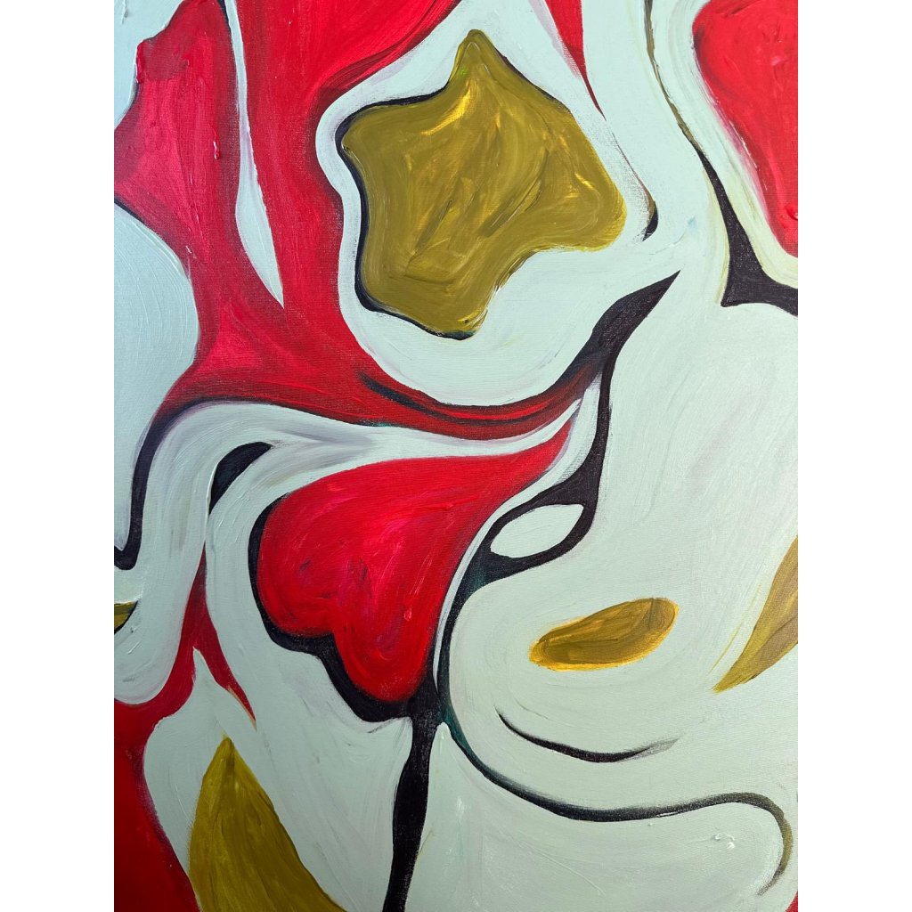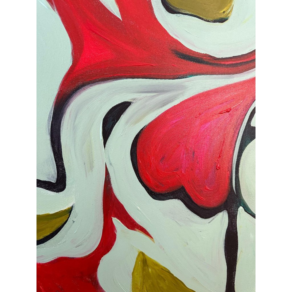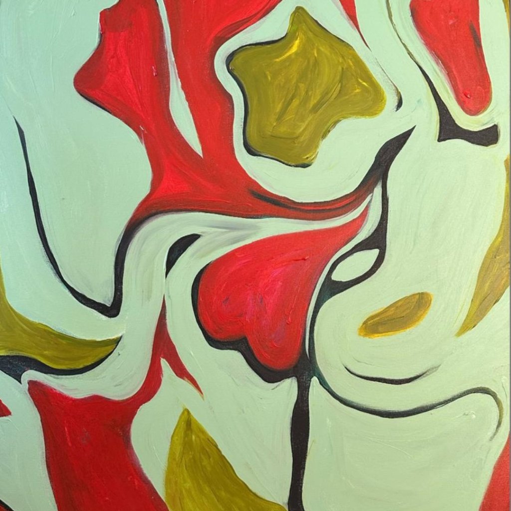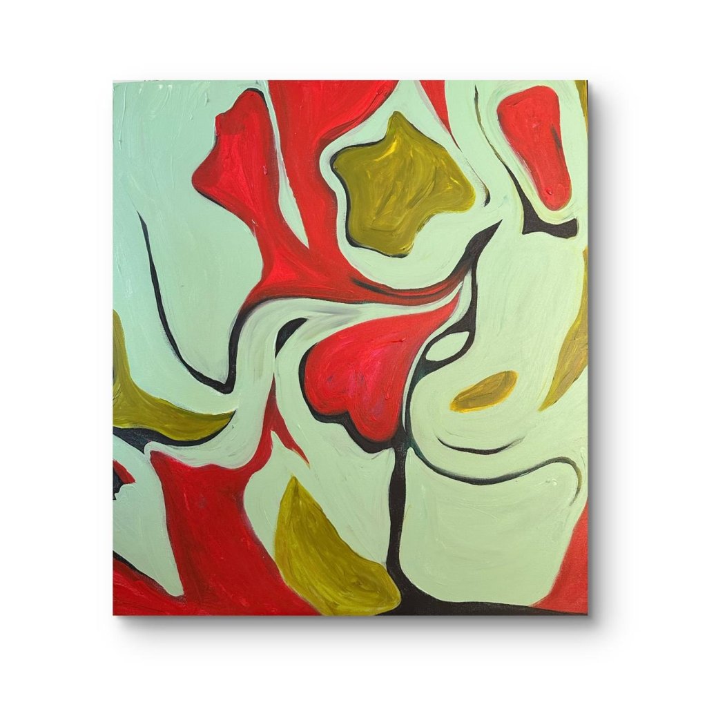 Svíjející se linie a měkké organické tvary vytvářejí dojem pohybu, připomínající tanec plamínků svíček nebo jemné šustění balicího papíru. Zlaté prvky působí jako symbol hojnosti a klidu, zatímco červená přináší do obrazu vášeň a emoci.