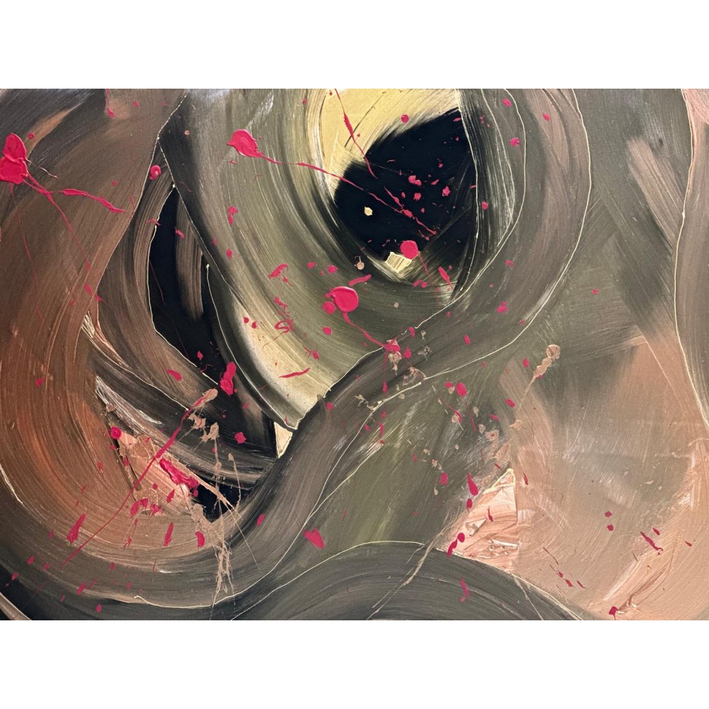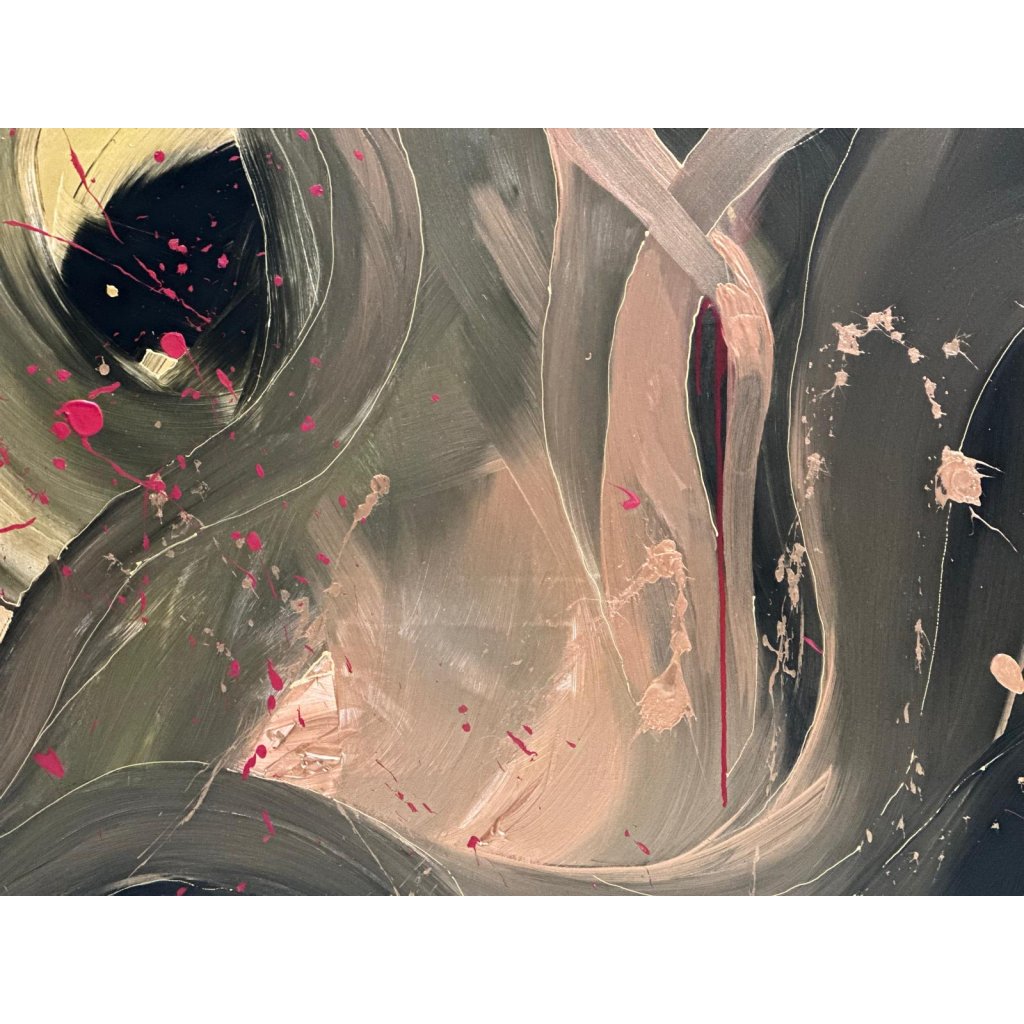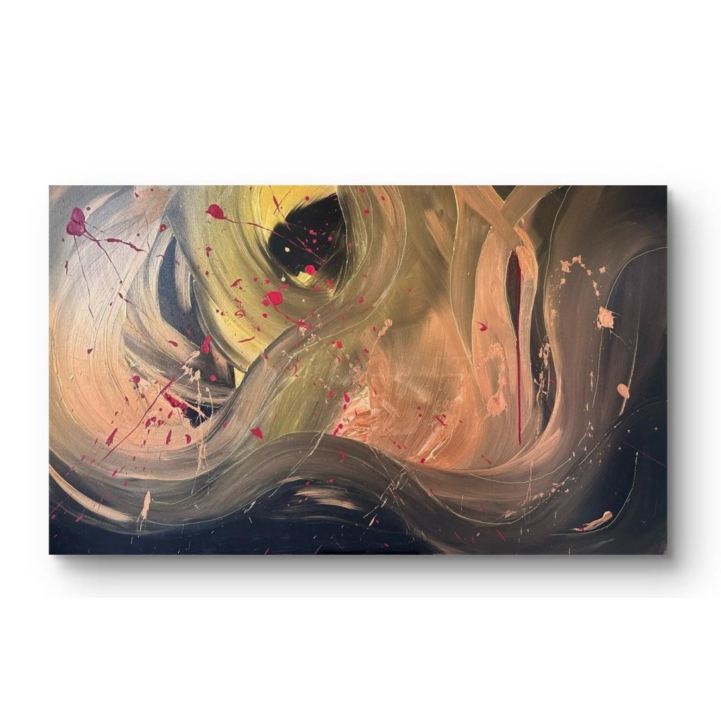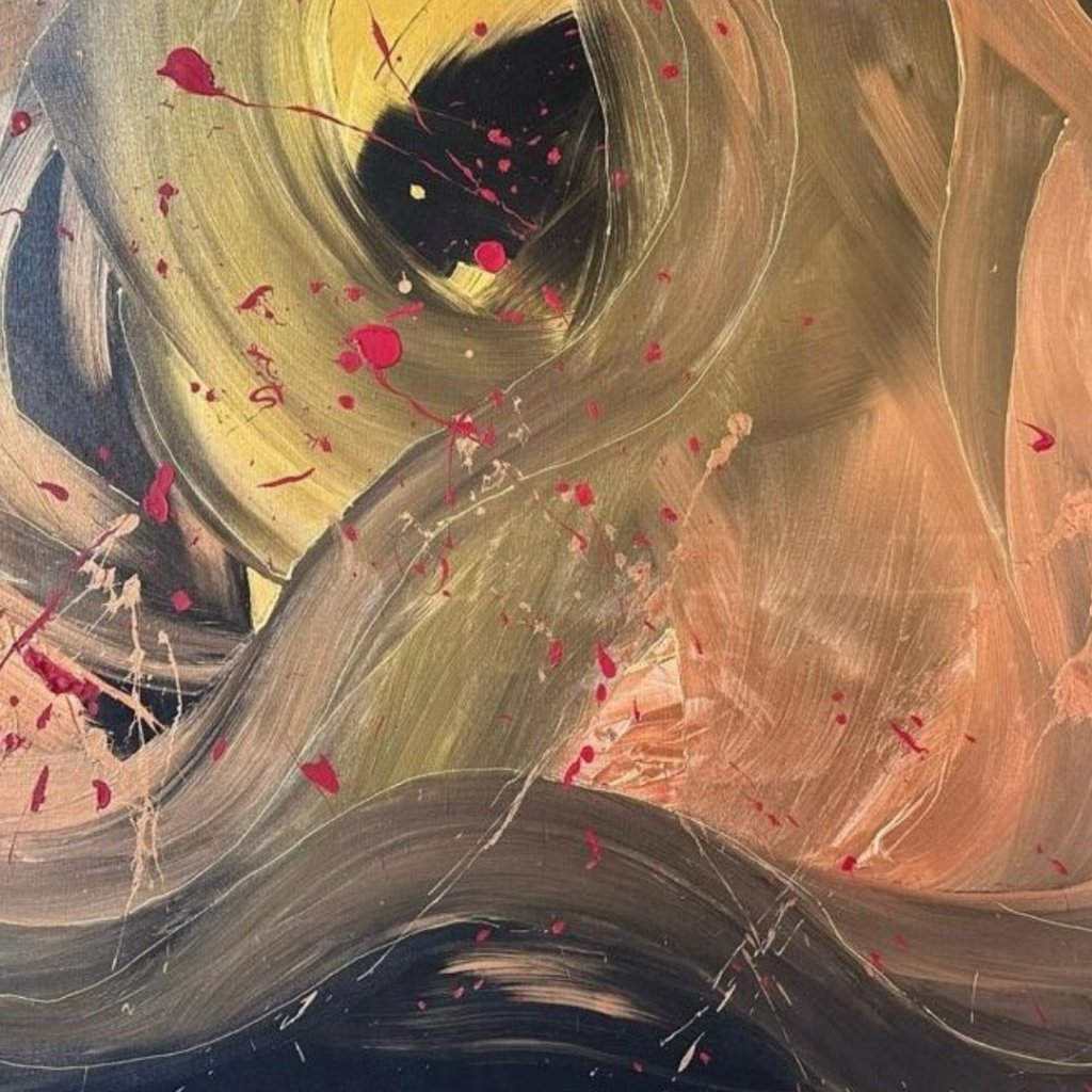 Obraz Vesmírné splynutí představuje vizuální meditaci nad propojeností sil a energií ve vesmíru i v nás samotných. Dynamické tahy štětce ve zlatavých, měděných a černých tónech vytvářejí proudy, které se vzájemně proplétají a stékají jako galaktické mlhoviny či proudy temné hmoty. Kontrastní kapky rudé barvy rozbíjejí harmonii a vnášejí do kompozice prvek napětí a života – jako záblesky hvězd nebo pulzující srdce.