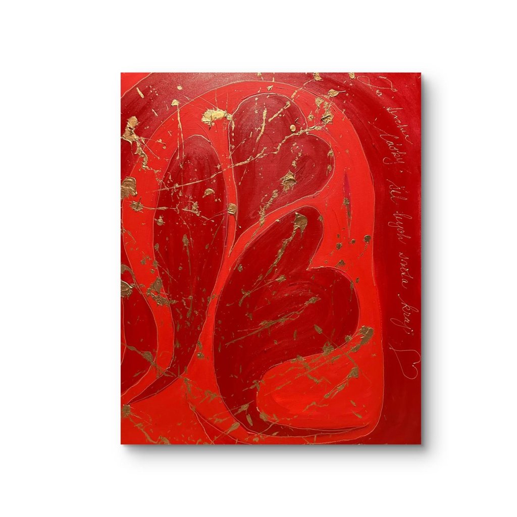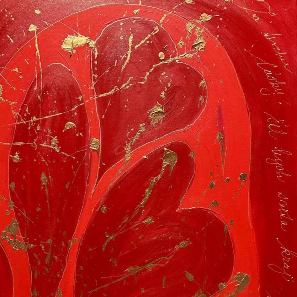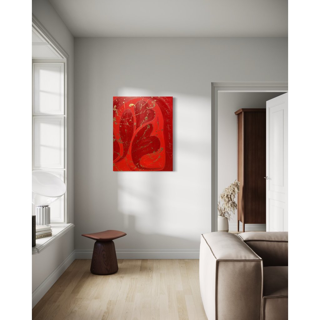 Tento obraz vznikl jako emotivní pocta hlubokému citu – lásce, která je spalující, něžná i zraňující zároveň. Dominantní červené srdce, rozdělené na tři části, symbolizuje různé fáze vztahu: vášeň, oddanost a ztrátu. Zlaté akcenty, vytvořené pravou zlatou fólií, připomínají, že i v bolesti se může zrodit krása – že i zlomené srdce může zářit.