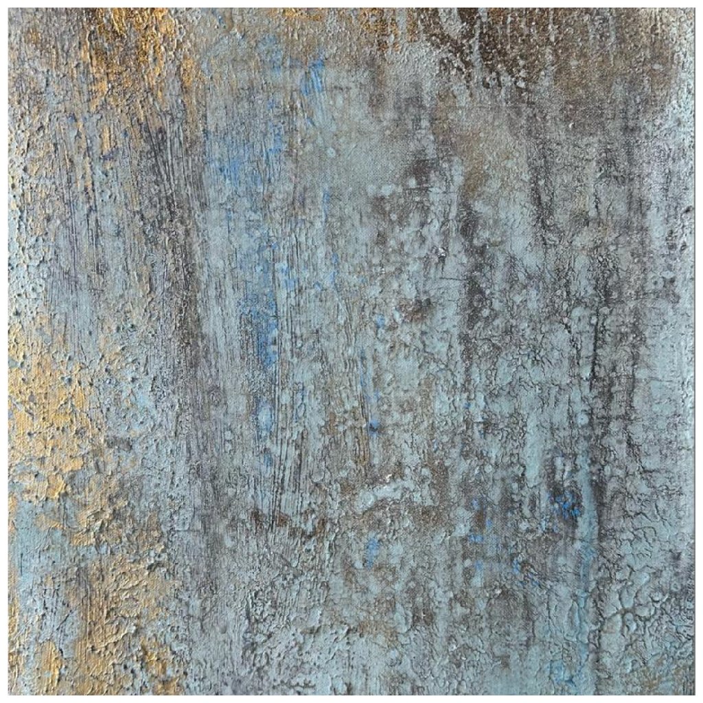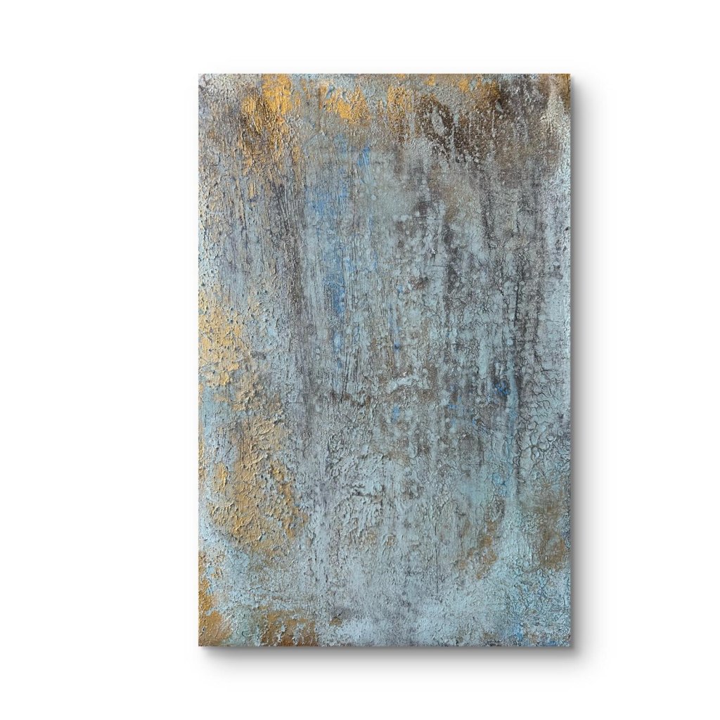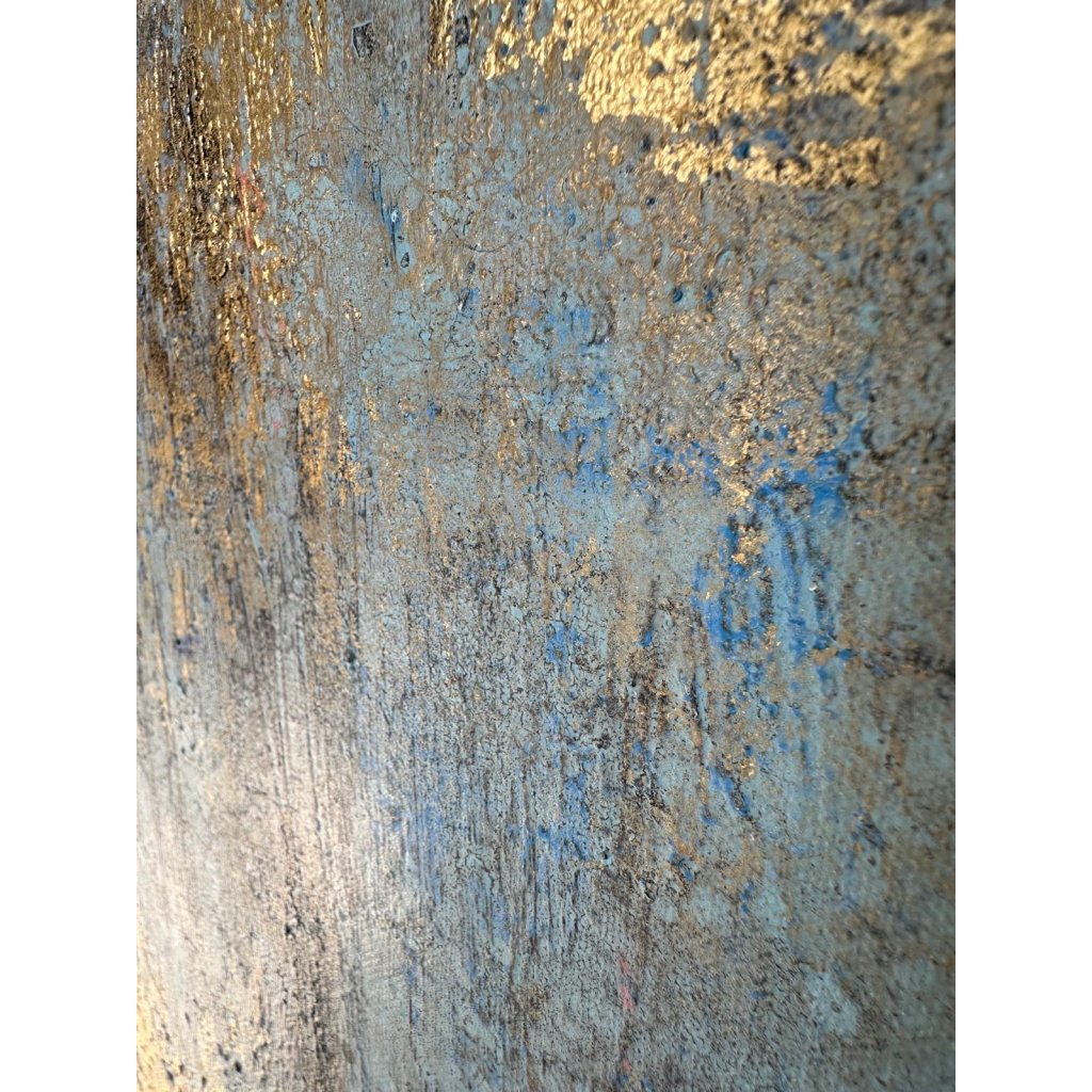 Texturovaný povrch dodává obrazu hmatatelnost, která připomíná popraskanou omítku starých domů, zatímco světle modré a okrové tóny přinášejí svěžest i teplo. Tiché vrstvy barvy jako by vyprávěly příběhy o zapomenutých uličkách, olivových hájích a azurovém moři.